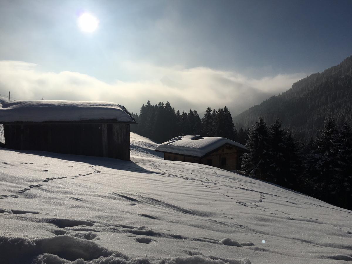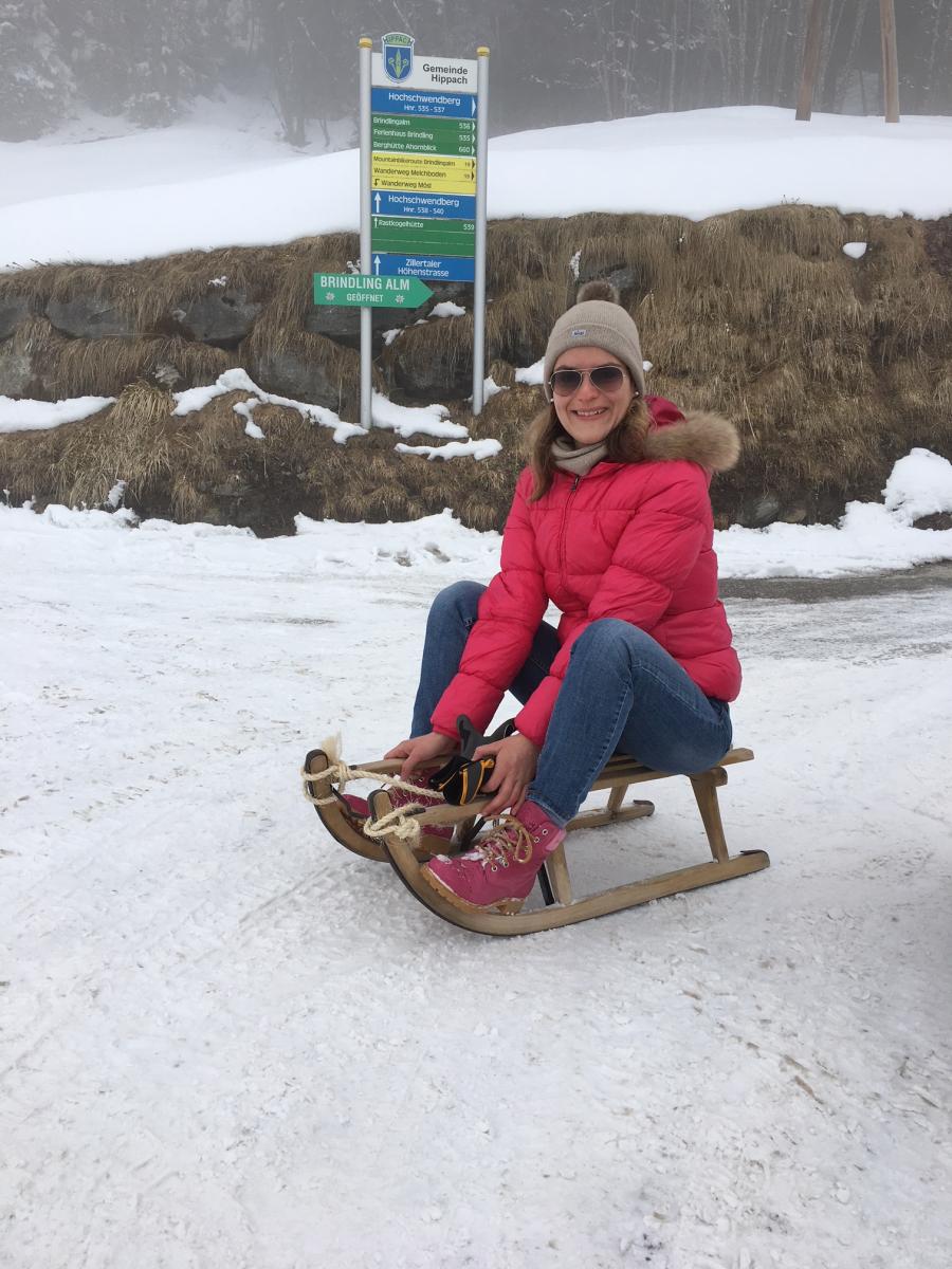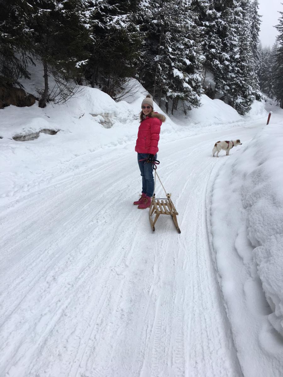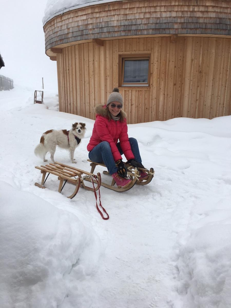 ...diesmal nicht mit Skifahren, sondern mit dem Schlitten ca. eine Stunde lang die romantisch verschneite Straße auf die Brindling-Alm gewandert...