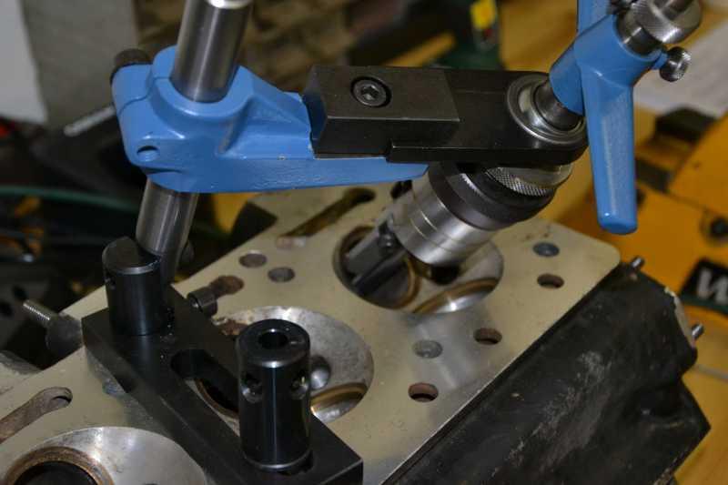 eine bessere Alternative zum Einschleifen ist die Ventilsitze zu "hungern". Früher war das ein stehender Begriff für den Einsatz eines Ventilsitzdrehgerätes der Fa. Hunger. Drehgerät, nicht Fräser, wie der moderne Schrott. Der Führungsdorn ist nicht nur in der Ventilführung gespannt, sondern am gegenüberliegenden Ende mittels der in dem Bild erkennbaren Stütze bzw. Lünette. So ist der Führungsdorn gegen Verbiegen sicher gelagert und der Sitz wird präzise coaxial gedreht. Bei der Betätigung der Handkurbel wird der Drehstahl automatisch vorgeschoben, um minimalsten Vorschub. Der Drehstahl hat im Prinzip nur Punktkontakt, so dass in Verbindung mit dem minimalen Voschub eine sehr gute Oberfläche erzielt wird. Es lassen sich alle drei Winkel eines Ventilsitzes drehen. Ich hatte mit das Gerät neu gekauft (gibts tatsächlich noch, die Fa. Hunger :D). Die Bilder zeigen den Einsatz am meinen Jarama Köpfen. Ansonsten, siehe auch hier: http://www.ludwig-hunger.de/deutsch/ludwig-hunger/produkte/produktbereich-automotive/ventilsitze-instandsetzen/vds1a-ventilsitzdrehgeraet/vds1a-ventilsitzdrehgeraet.html
