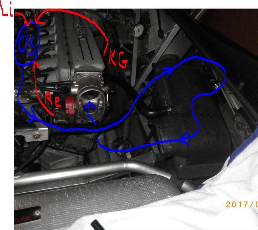 So läuft hier die Entlüftung und Rückführung. Rot sind die Absaugungen, also linker Nockenwellenbereich Li , rechter Nockenwellenbereich Re und Kurbelgehäuse KG.