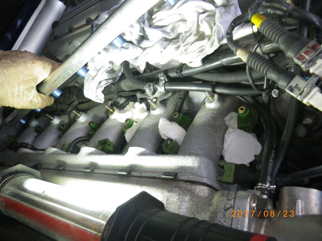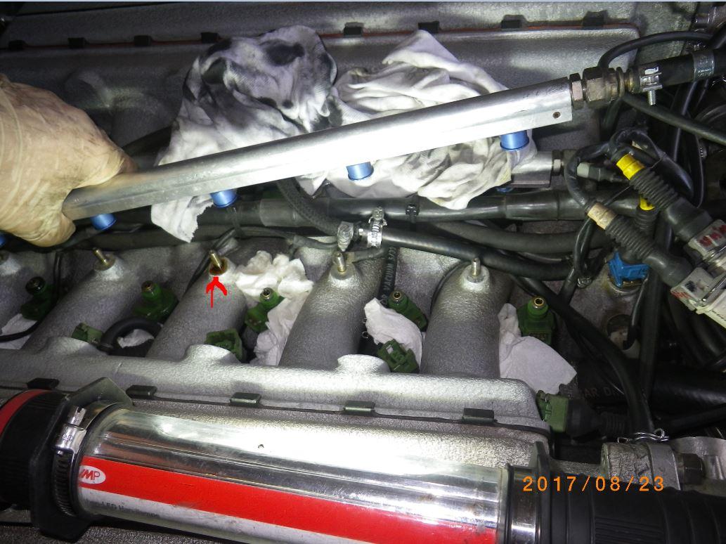 Hinten Benzinleitung vor dem Druckregler aufgemacht und Rail gezogen: