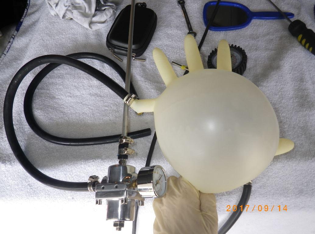 Nun beim Benzinrail reingeblasen zum Schnelltest des Benzinpumpenrücklaufventils. Das ging nicht. Dann mit Kompressor begrenzt auf 2.5 bar. Zu unruhig für eine Beurteilung, da nicht noch zusätzliches Ventil verfügbar.