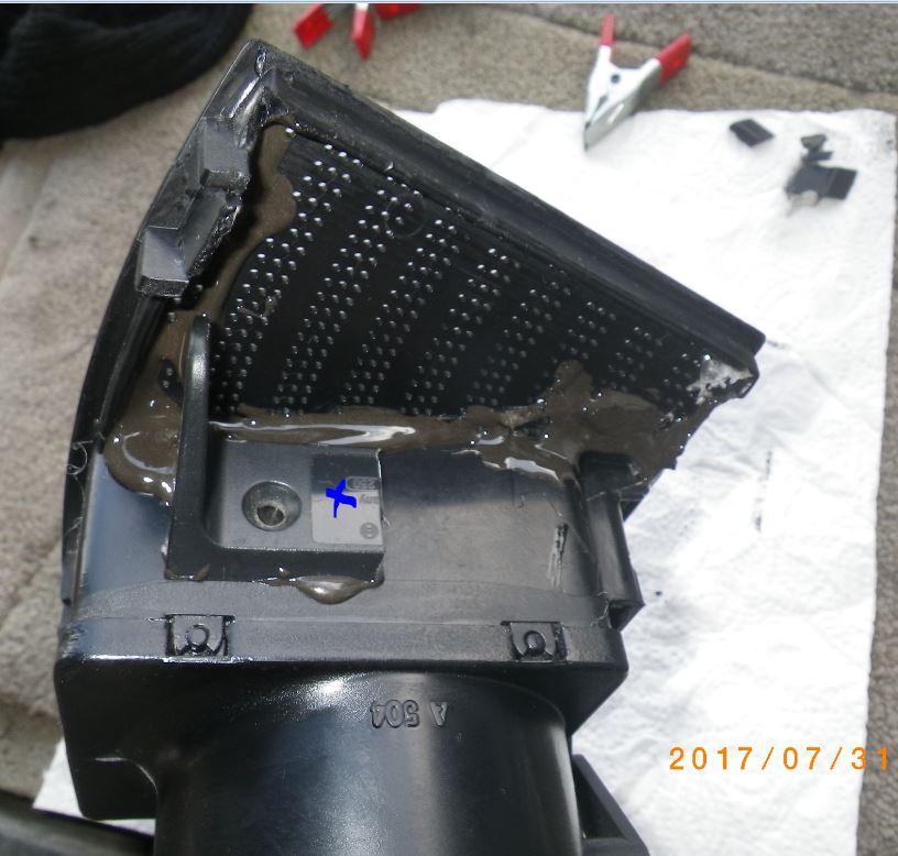 Das Teil war teilweise mit Silikon eingeklebt. Das muss noch aus den 90ern sein. Ich wars net. Eins der beiden unteren Kleinteile brach beim Ausbau ab, zumindest war da kein Riss zu sehen in der klebrigen Beschichtung.