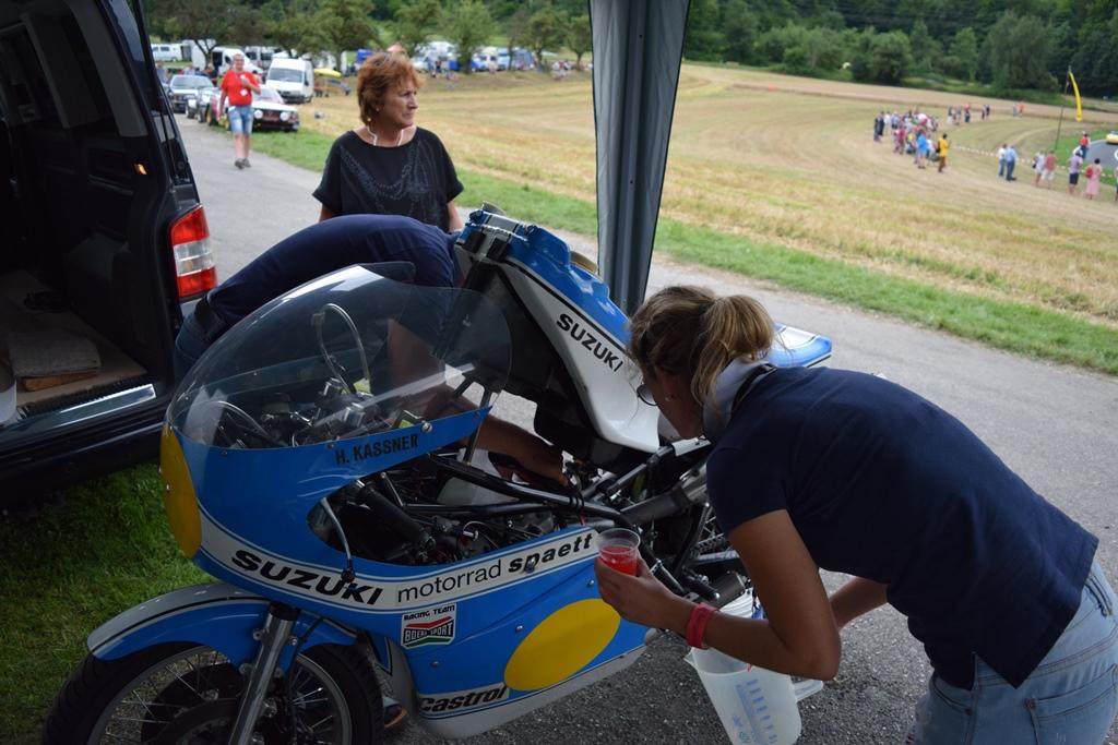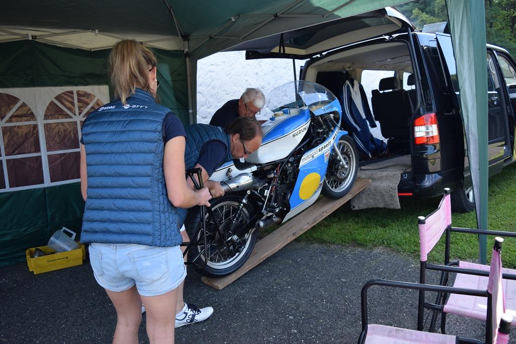 Nach zwölftjähriger Standzeit wurde die Suzi, wie wir sie nennen, wieder zum Leben erweckt. Eine Komplettrevision des Motors war notwendig. Die Teilebeschaffung bei einem 40-jährigen Rennmotorrad ist sehr aufwändig; aufgrund der geringen Stückzahl der gebauten Maschinen sind viele Teile überhaupt nicht mehr verfügbar. Neue Reifen waren ebenso fällig.