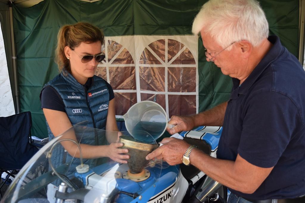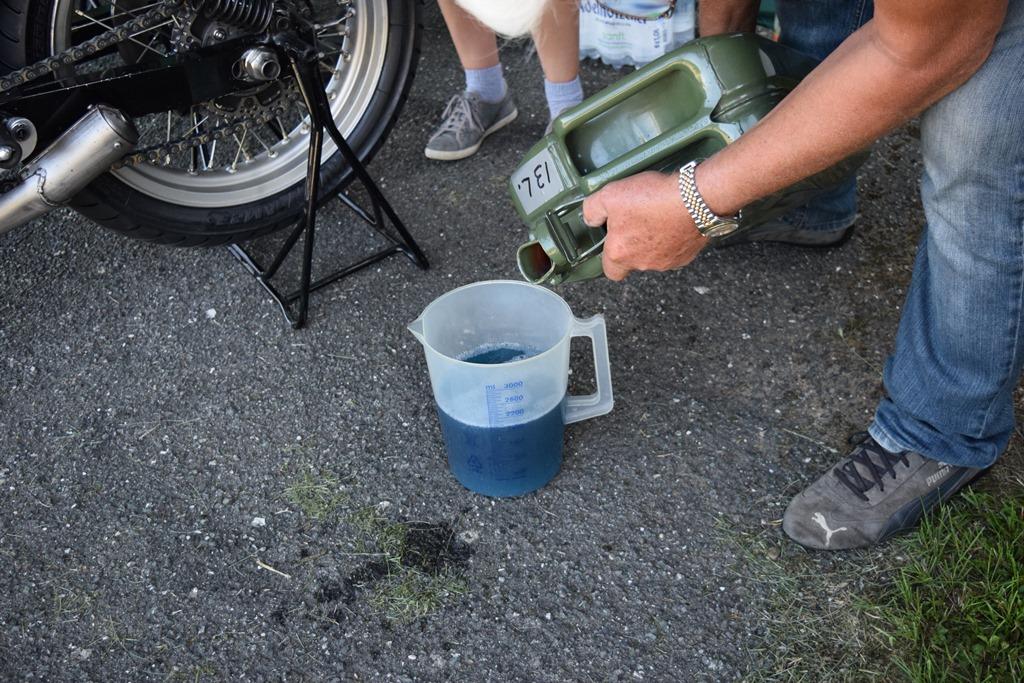 Das spezielle Rennbenzin wurde schon von mir vorab im Fass bestellt und vor Ort angemischt. Wir tanken nach genauer Berechnung des zu erwartenden Verbrauchs.