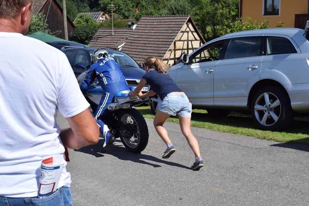 Tessi bekommt keinen Fuss auf den Boden: Ein "fliegender" Start? Eine neu Sportart, in der Frau sich am Heckl eines Motorrad in die Luft drück? Wie, wenn ein Engel anschiebt?