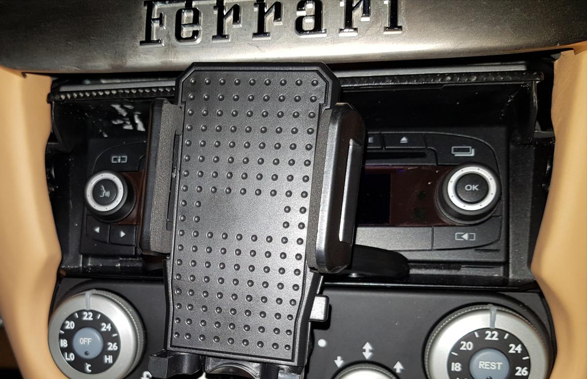 Handy-Halterung im Zigaretten-Anzünder. Das Ding ist allerdings nicht sonderlich stabil...