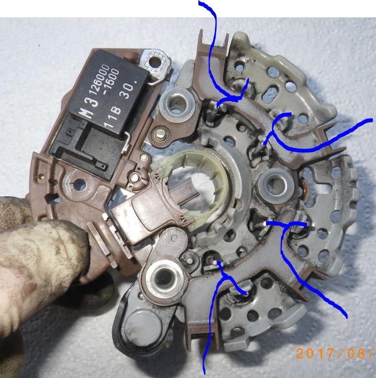 Und hier die Verbindung zu den Wicklungen über die 4 Anschlüsse. Jeder dieser Anschlüsse geht dann auf 2 Dioden. Eine Diode jeweils dann auf die Plus- und und eine auf die Minusplatte.