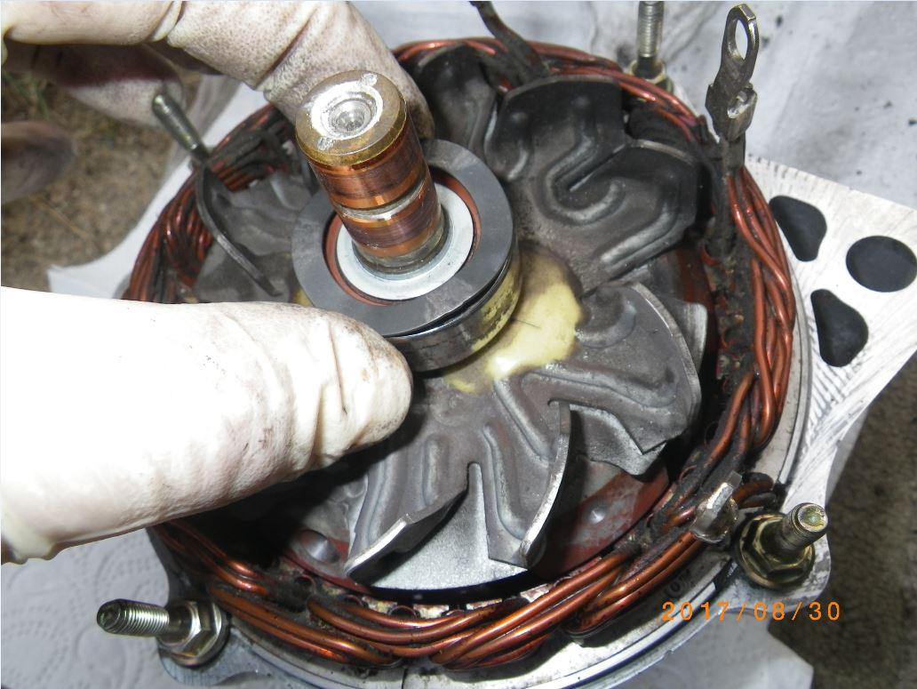 das gleiche symptom hatte ich erst die tage bei einer 140A valeo mit sehr ähnlicher bauart...wenig km und auch kontrolleuchte geht sporadisch an und aus oder teilweise garnicht. da hab ich mir mal den spass gemacht zwecks Diagnose zu zerlegen...auffällig war gleich leicht ölneblige Oberflächen der innerreien (deutlichst weniger als an deiner) das öl hat wohl etwas leitende Wirkung innerhalb der gleichrichterplatte bewirkt (ca 3,5M-ohm) wo eigentlich durch Diode gesperrt sein sollte...der effektive  ausfallgrund war hier jedoch eindeutig zu sehen : die dem Gehäuse zugewandte kohle wurde wohl durch den internen lüfter ständig mit öl versorgt und ist,wie der zugehörige Schleifring, fast komplett weggeschliffen.das gehäuse welches die kohlen abdeckt ist voll von öl-kohle-schlammgemisch :-o