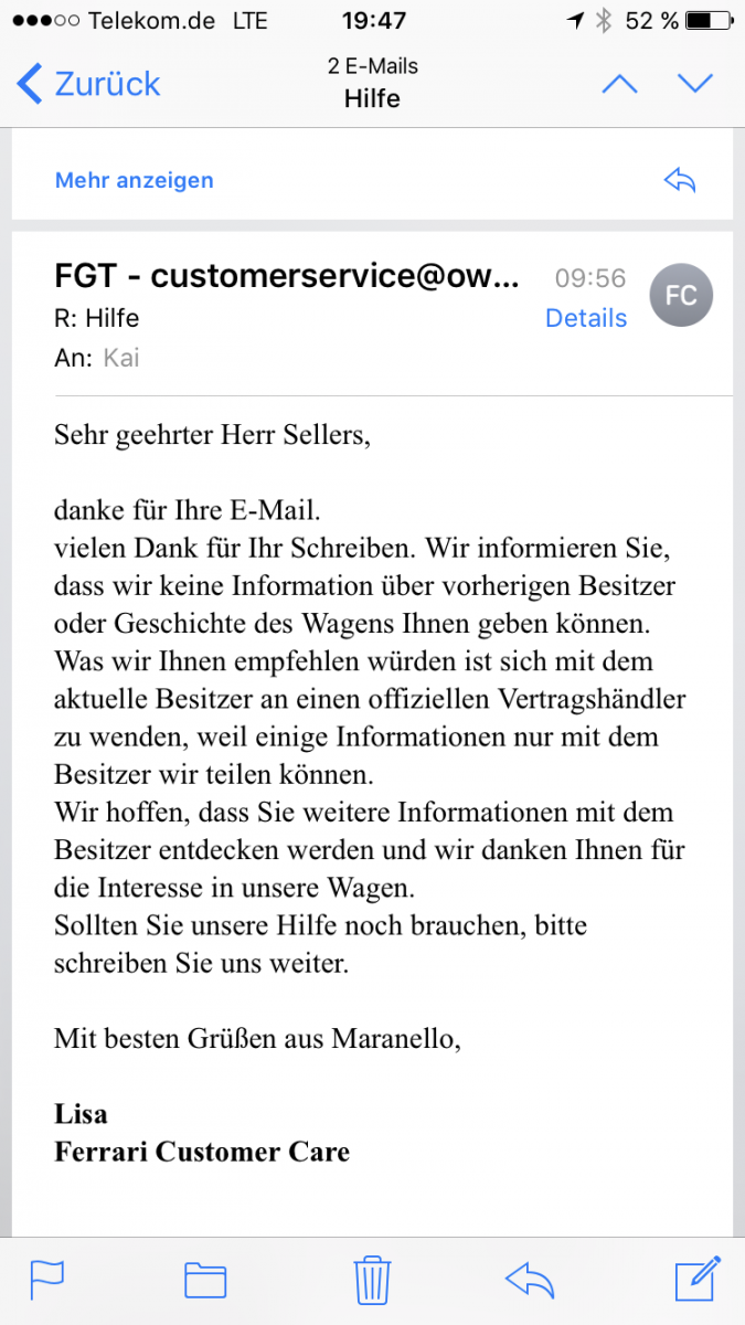 Ich habe mal Ferrari Customer Care angeschrieben.