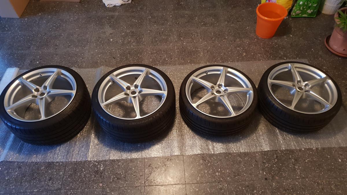 An meinem Geburtstag habe ich mich irgendwie fast ungeplant selbst beschenkt. Ich hatte mich anfangs ja gegen die schwarzen Felgen entschieden und neue silberne originale Felgen gekauft. Das war optisch eine wunderbare Entscheidung die ich auch nicht bereue. Ich habe aber bei diesem Hobby immer wieder Spaß an sinnvollen Optimierungen. Gewichtsersparnis, Leistungssteigerung und Verbesserung der Fahrbarkeit stehen hier immer besonders im Vordergrund. Natürlich beim Thema Felgen auch immer optisch. "Felgen machen Autos" - diesen spruch kann ich sehr oft unterschreiben. Gerade bei meinem Auto ist das schwer. Ich finde meinen 430er sehr sportlich (durch das ganze Carbon etc.), aber auch durch die Farbkombi sehr edel. Da muss man schon sehr aufpassen nicht zu viele Farben ins Spiel zu bringen. Ich hatte oft Scuderia Felgen oder die BBS FI im Auge. Eine leichtere Felge als die BBS gibt es wohl für den 430 nicht. Beide Felgen gibt es in anthrazit bzw titan. Letztlich ist es jetzt halt doch die silberne 5-Stern Schmiedefelge vom 458 geworden. Ich empfinde sie als sportlich, edel und filigran. Zudem ist sie leichter in 20 Zoll wie die Serie in 19. 20 Zoll steht dem 430 sowieso gut. Ferrari hat die Felgen in den USA fertigen lassen. Um Material und somit Gewicht zu sparen, kann man gut sehen wie an einigen Stellen noch hinterfräst wurde. Dazu gab es Michelin Pilot Super Sport, die ich den Pirellis jederzeit vorziehen würde. Dienstag kommen sie aufs Auto, dann gibt es Bilder. Danach kann ich auch genaue Aussagen zum Gewicht machen. Es geht also weiter! :-))!
