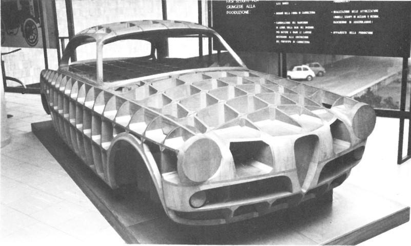 Bertone, der Schöpfer dieses Alfa Romeo Sprint Modells, hat in der Epoche bis Mitte der 1960er Jahre definitiv nicht mit (recht-)eckigen Scheinwerfern experimentiert. Hier das Holzmodell des Sprint: