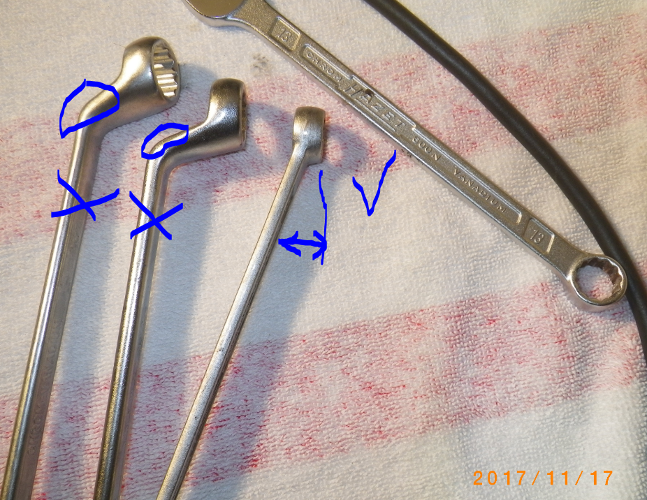 Der Kröpfungswinkel (unten), den ich weiter oben noch in Frage gestellt habe und auch Vorschlag von bozza, würde sicher reichen. Die beiden Schlüssel rechts sind 13er statt 15er, aber man sieht gut, wie sauber die unten gearbeitet sind. Dieser Typ wäre für ein Werkzeug geeignet. Den habe ich aber nicht in SW15. Die anderen links würden am Kringel anstehen. Solche gehen also nicht.