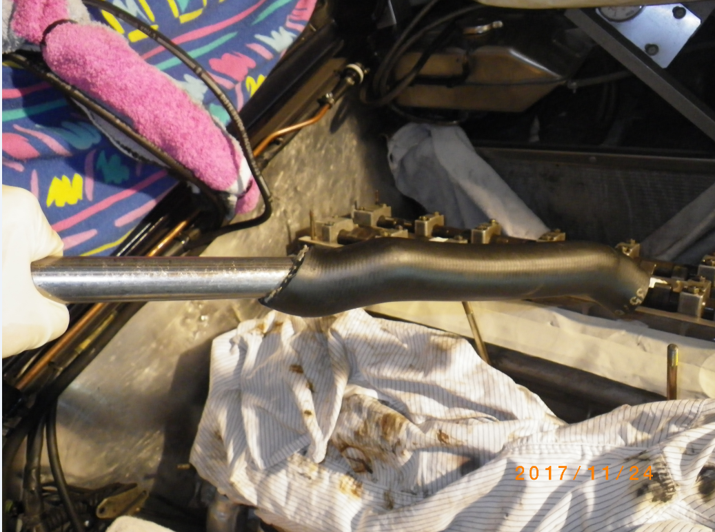 der Plan war, erstmal leicht am Krümmer von Hand zu rütteln als erster Versuch. Der ist aber ab. Es gibt hier viele mögliche Stellen. Zum Beginnen ist ca. die Mitte gut. Da war der Ursprüngliche Gedanke, hydraulisch von unten außen.