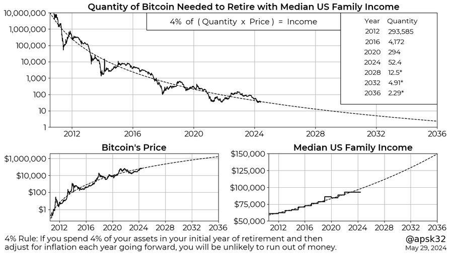 Wie viel Bitcoins man zu unterschiedlichen Zeiten besitzen müsste, um davon einen jährlichen, medianen US Lohn auszuzahlen.