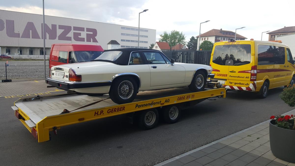 Zunächst verlief die Fahrt völlig problemlos und sehr entspannt und entschleunigend. Als sich dann aber die Anzeige der Batteriespannung apprupt in Richtung 9 Volt bewegte und der zuvor samtig schnurrende V12 zu stottern begann, kam doch etwas Hektik auf, und es blieb uns nichts anderes übrig, als die Katze auf dem Pannenstreifen abzustellen. Nachdem das Reanimieren mit dem Powerbooster nicht zum Erfolg führte, mussten wir den Jaguar auf dem Hänger nach Hause shippen lassen.