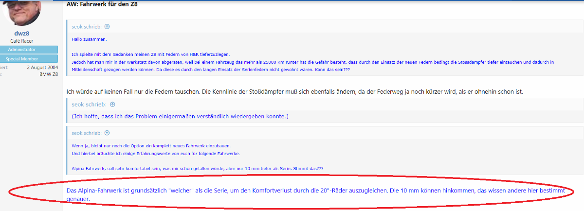 Stimmt schon mitm Alpina Z8 und der weicheren, komfortableren Abstimmung. Auf der Retro stand mal einer zum Verkauf, da wurde explizit darauf hingwiesn.