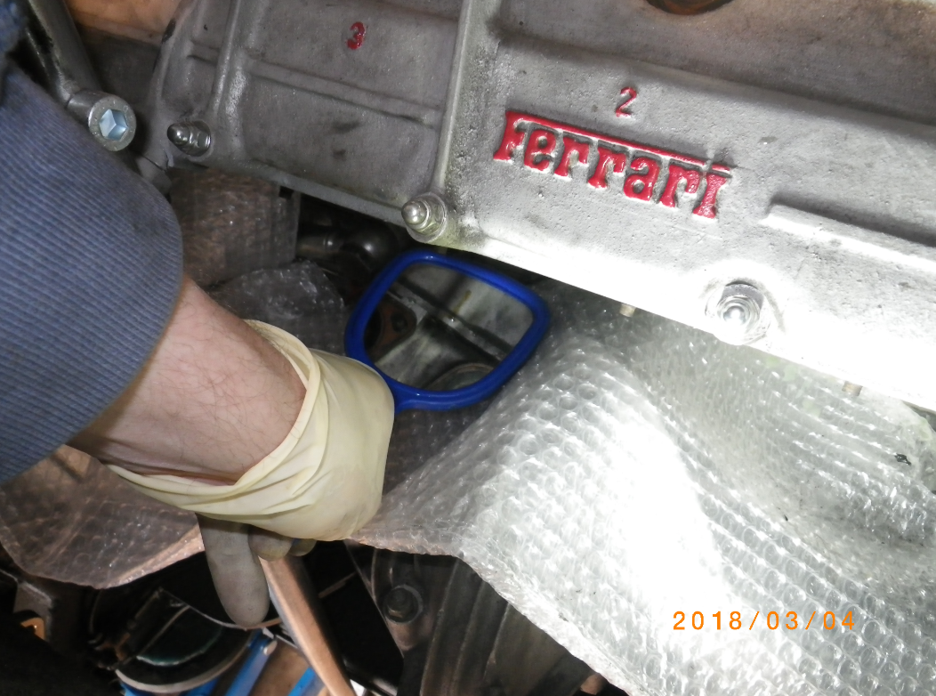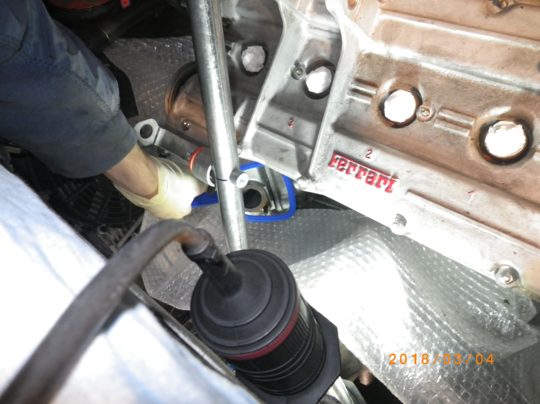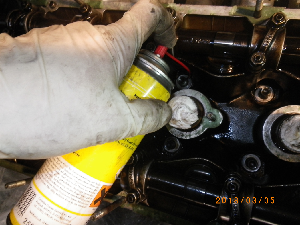 Dann die bozza-Stufe gezündet: Habe Caramba am Gewinde reinlaufen lassen. Das ist an 4 Stehbolzen langsam machbar. An den anderen 6 kann man fluten. Da kann der Löser nicht weg und verschwindet am Stehbolzen.