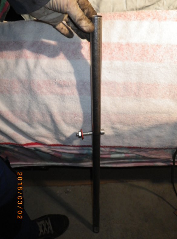 Ein Vierkantrohr zum Zerstückeln opfere ich jetzt hier nicht und auch einen passenden langen Bolzen habe ich nicht gesucht. Stattdessen dünnen Rohr und kleine Schraube, die nur an einer Seite fest ist. Später soll ein Bolzen durch beide Löcher.