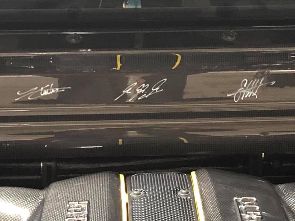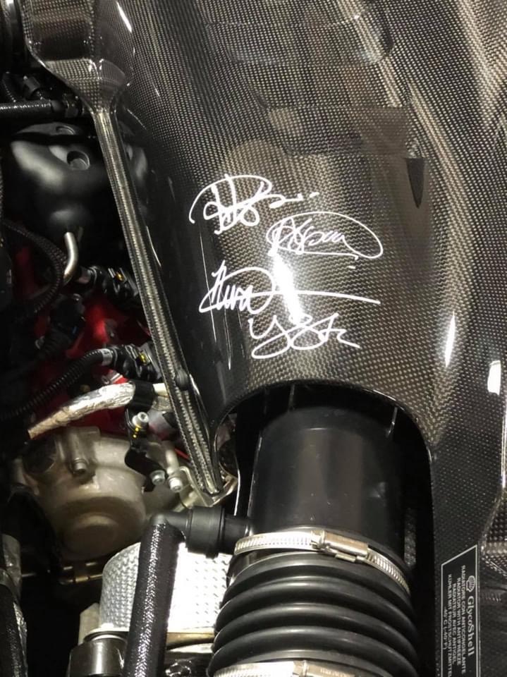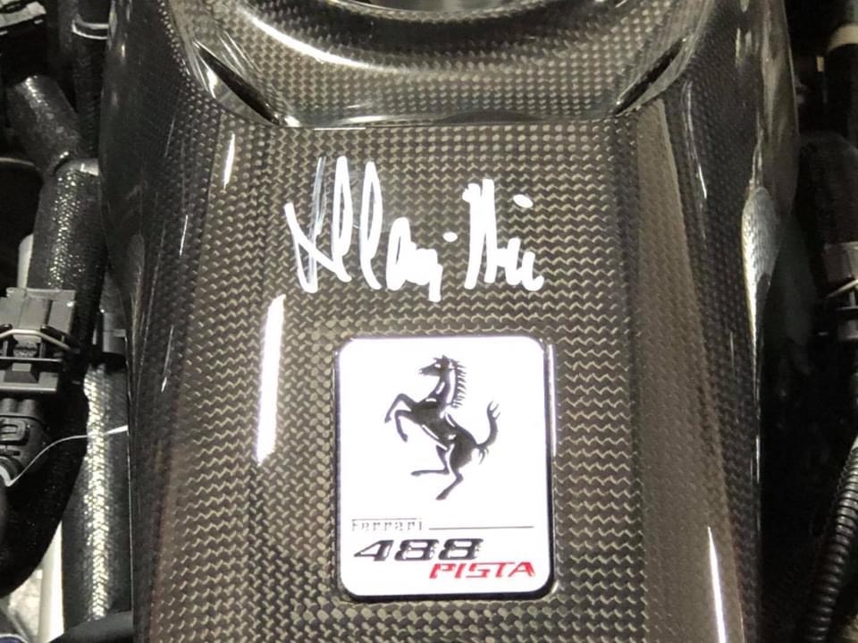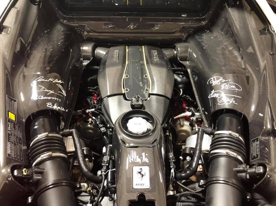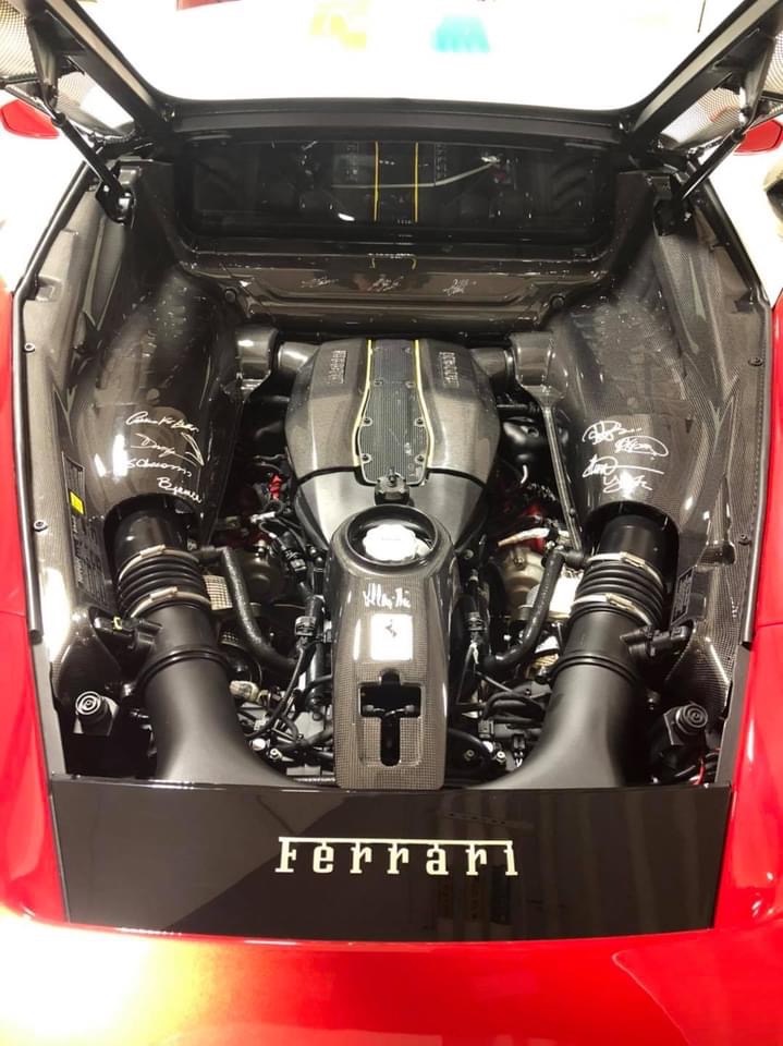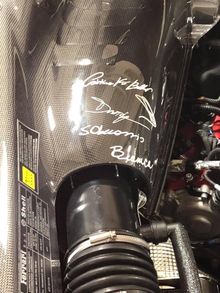 The Engine bay in full carbon has been signed by the Current Ferrari F1 driver Charles Leclerc, Sebastian Vettel ( 4 time world champion and last Ferrari driver to drive a F1 car with the number 1 ) Mick Schumacher ( son of Legendary Ferrari F1 driver Michael Schumacher ), The Ferrari CEO Louis Camilleri along with the signatures of the Ferrari design team!