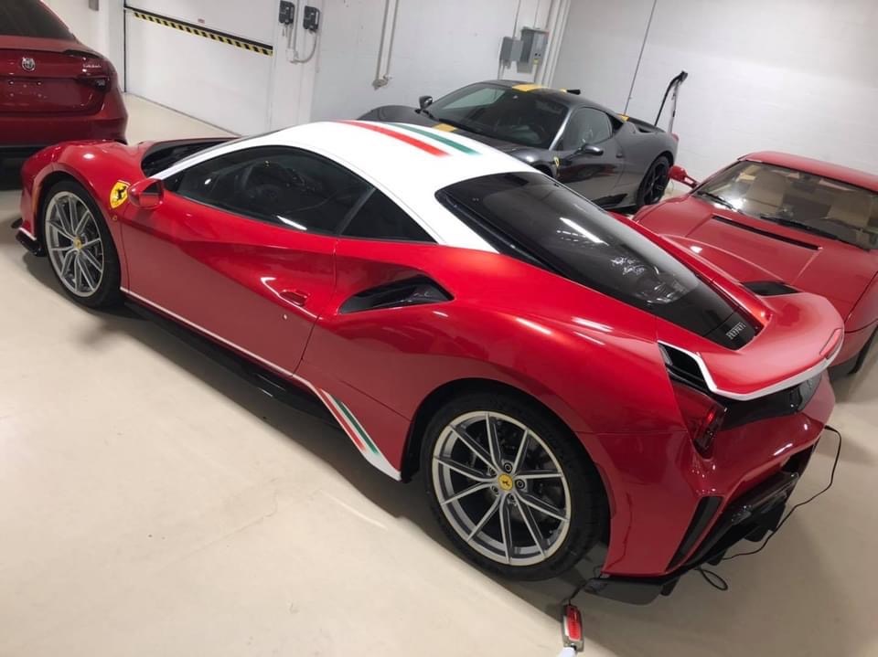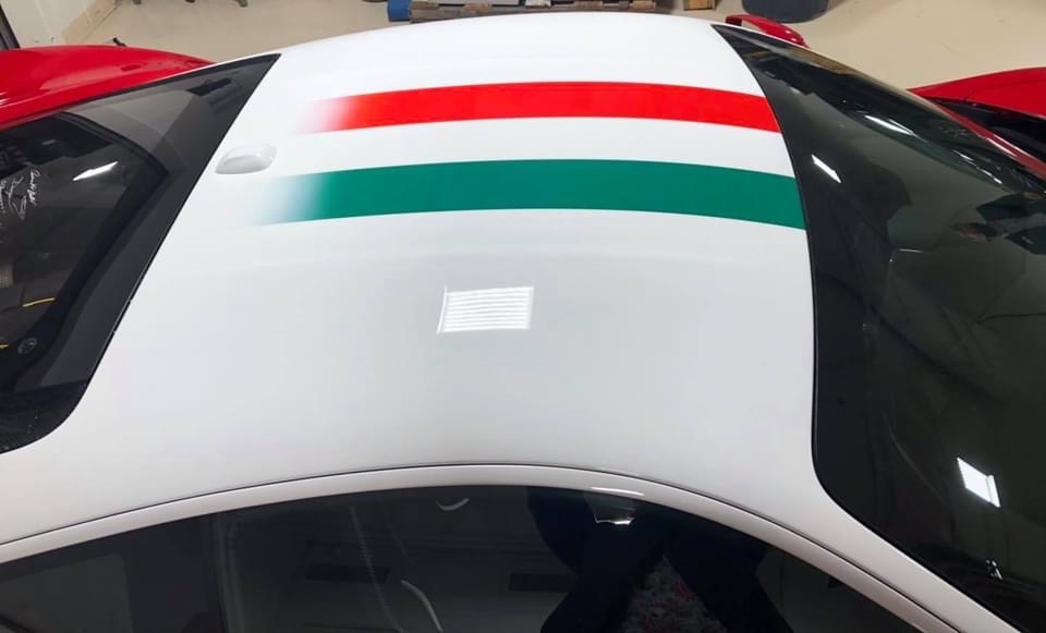 This one of a kind factory build starts with special exclusive 1 off PPG paint made exclusive for the owner and is called Rosso Kapoor (exterior) with Tetto Bianco King (roof) & Livrea Tricolore Italiano fading racing stripe.