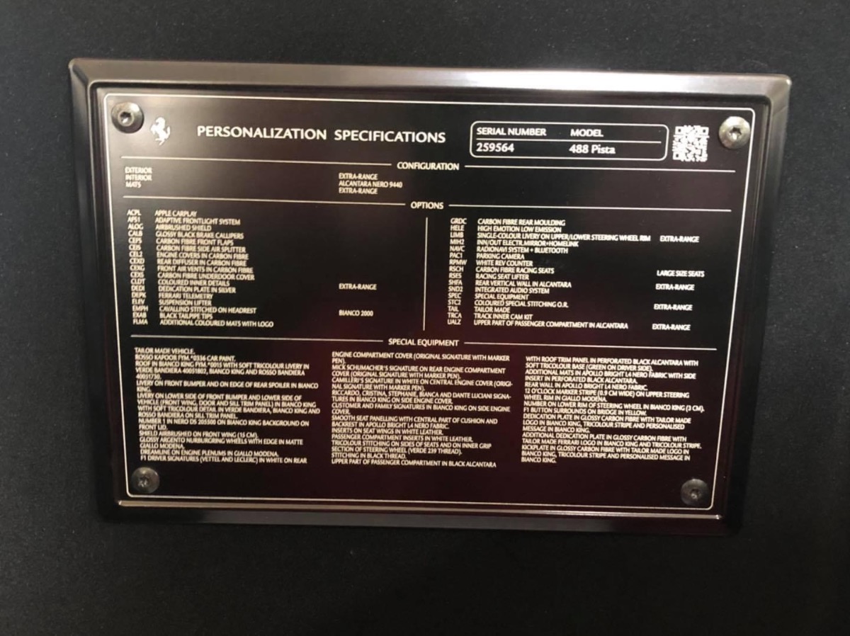 The list of extras on this breathtaking 1 of 1 Pista are too numerous to list on the standard dedication plaque so a special typeset and font had to be used for the first time by Ferrari so all the upgrades could be listed on the dedication plaque.