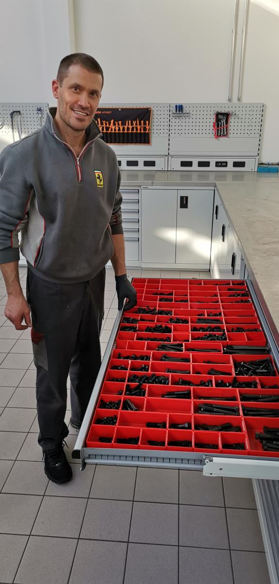 Hier vor einer von, grob geschätzten, 100 Schubladen worin fein säuberlichst Kleinmaterial sortiert aufbewahrt wird.