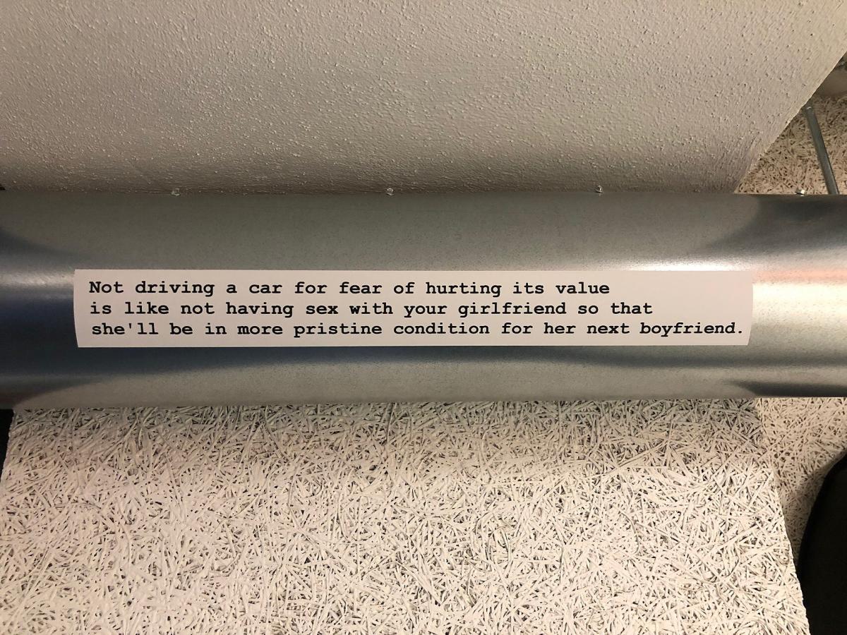 M.E. ist die Promotion des Autos zum Kunstgegenstand (mit Wertzuwachs) nichts anderes als der verzweifelte Versuch, Absolution für den Erwerb des selbigen zu erhalten.
