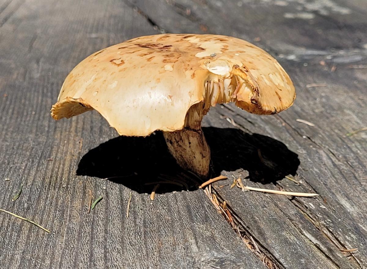 Nur zwei Wanderer getroffen. Der Weg ist sicher nicht viel bewandert, sonst wäre der Pilz auf der Bank wohl nicht so gross geworden.