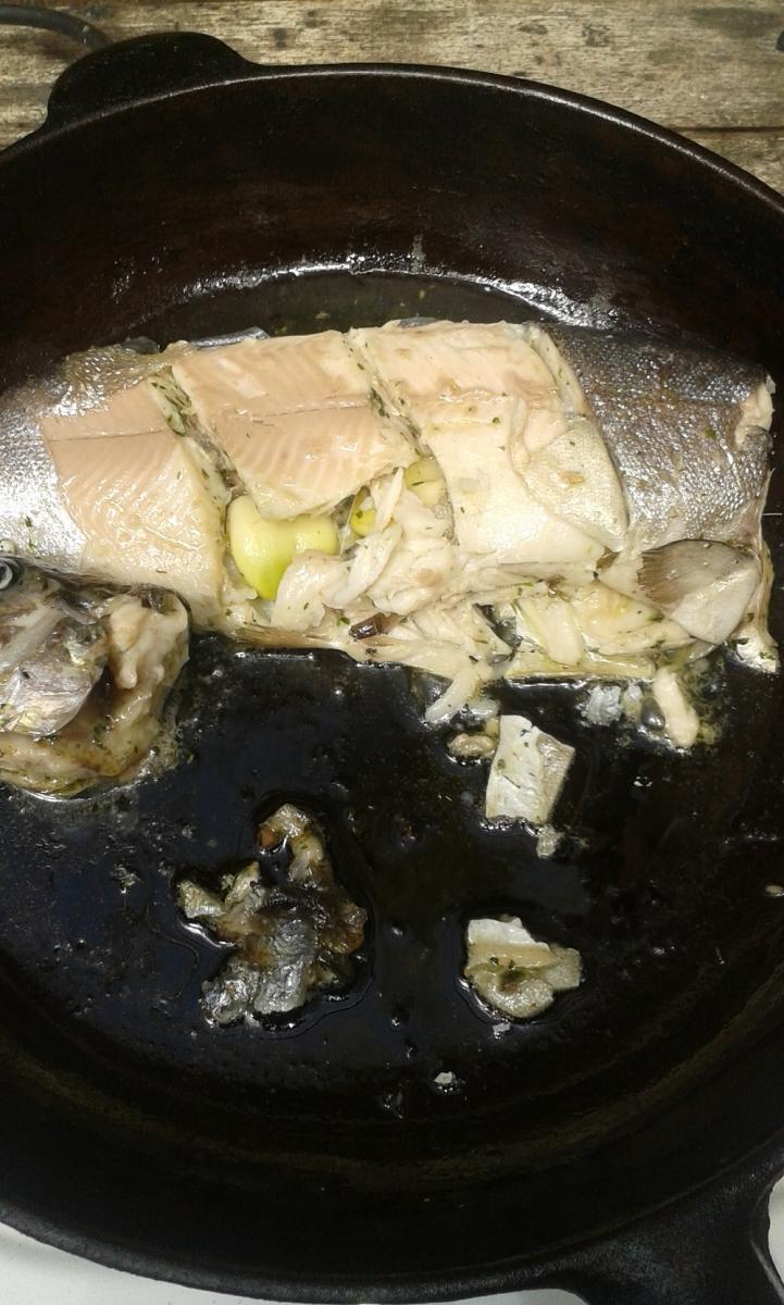 Da Arbeit hungrig macht, in den Supermarkt gefahren und marinierte Regenbogenforellen gekauft.