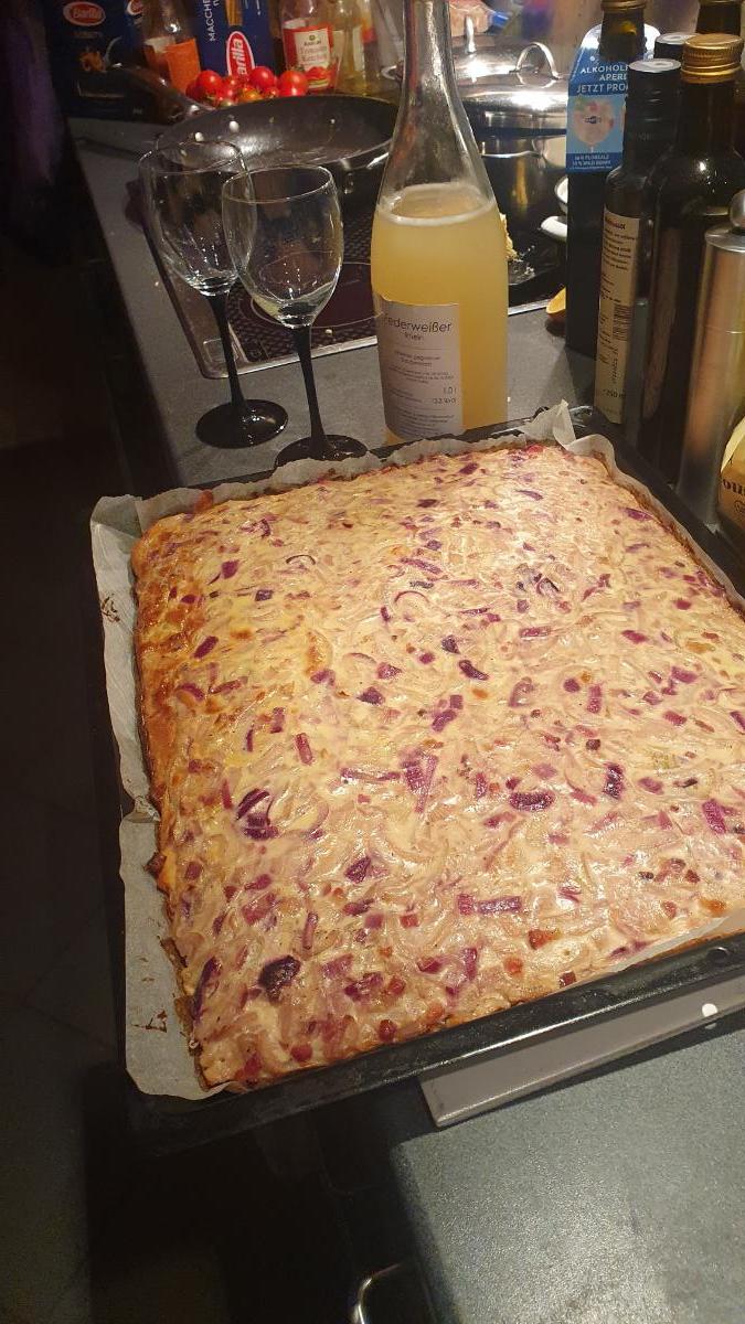 Selbstgebackener Zwiebelkuchen und Federweißer aus Rheinhessen (selbst geholt am Freitag!)