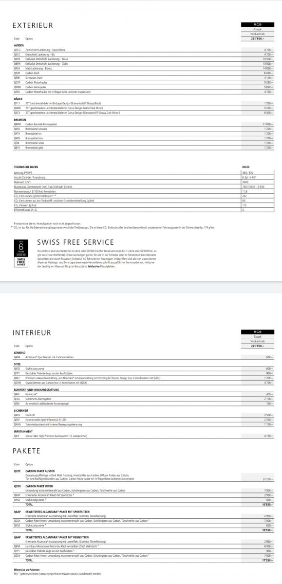Finde diese aber recht kurz mit einer Seite. Problem ist wie geschrieben, dass ohne Carbonbremse, Soundsystem und Co deine Bestellung weit nach hinten rutscht. Ansonsten kommt man auf knapp 250.000 Euro ausgestattet. Und dann kostet der Maserati knapp 10.000 Euro weniger als mein F8. Und da setzt es bei mir geistig aus.  Die offizielle Stückzahl für Europa in 2021 ist mittelhoch dreistellig.