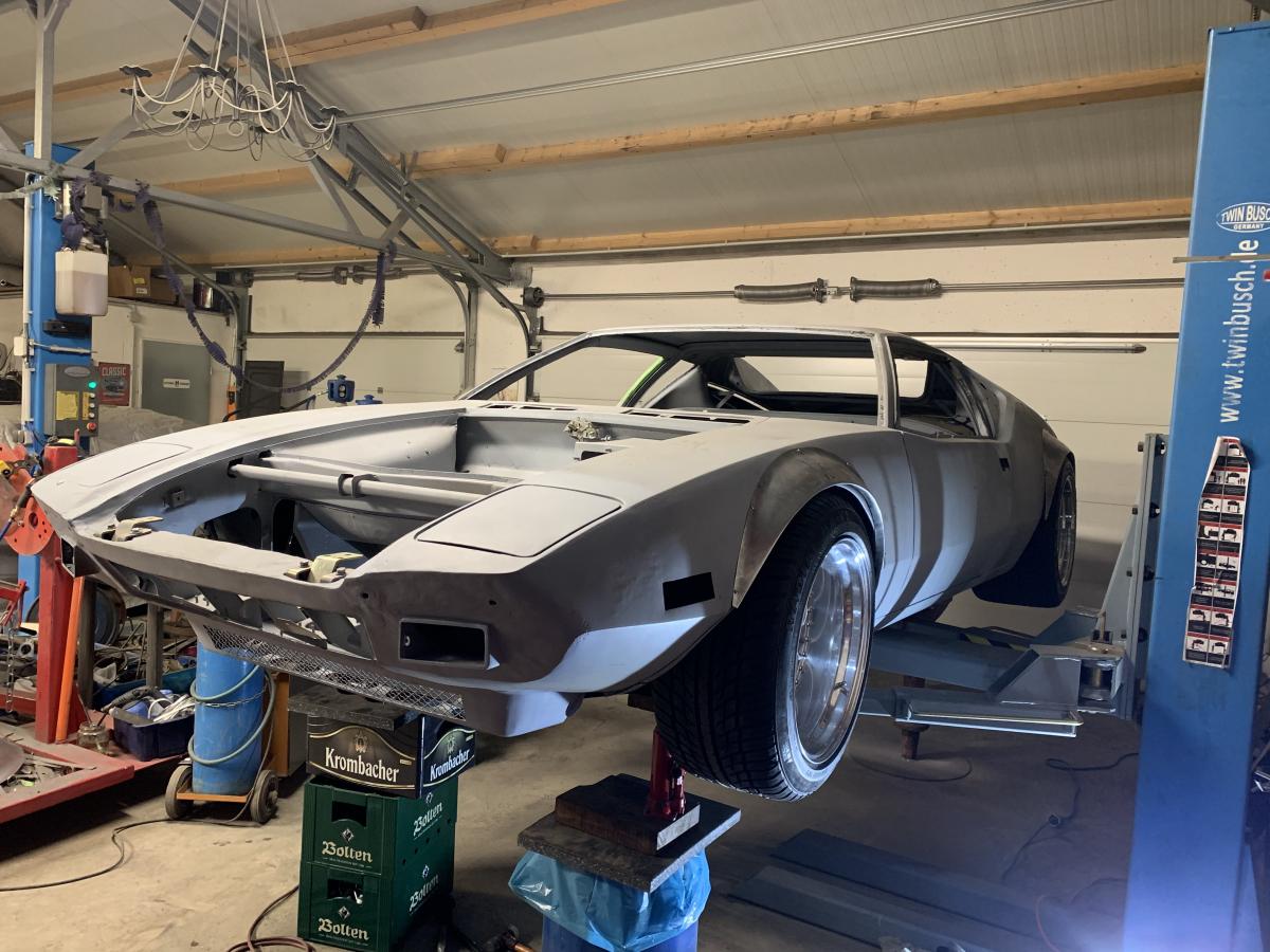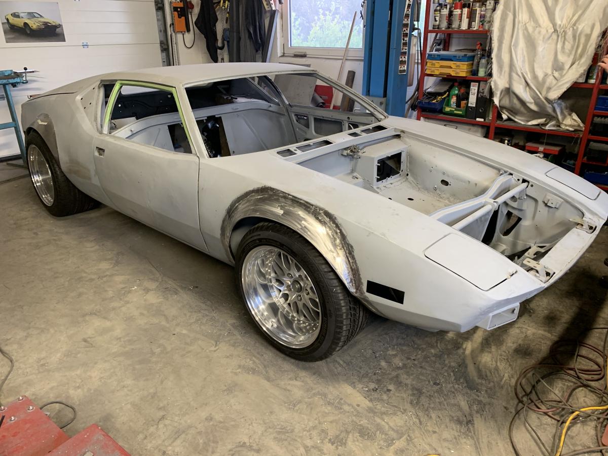 Das Lenkrad habe ich neu beledern lassen und habe mir dann in meinem Betrieb einen Edelstahlstern gelasert mit DE TOMASO und PANTERA auf den seitlichen Speichen und meinen Initialen in der Unteren. Miitig ein Drehteil mit dem eingklebten Logo. Gefällt mir gut.
