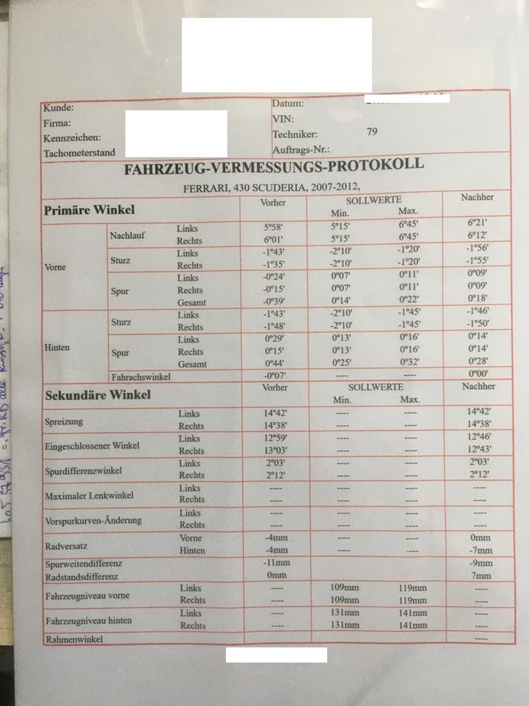 Es ist jetzt fahrdynamisch ein ganz anderes Auto. Viel höhere Kurvengeschwindigkeiten, direkter und trotzdem mit einem guten Geradeauslauf. Hier das Protokoll der Achsvermessung: