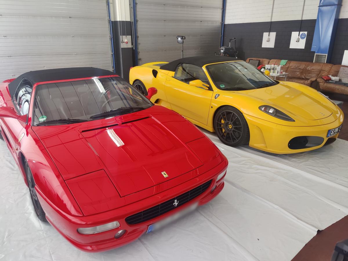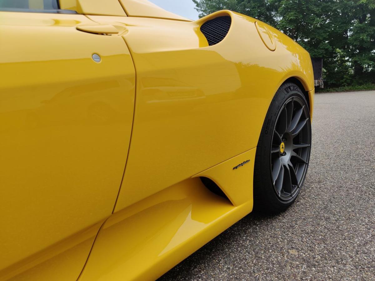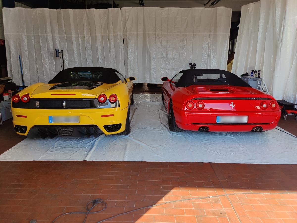 Steinschlagschutzfolie habe ich das aktuelle Kit von Ferrari genommen, außer hinten an den Lufteinlässen der Schweller. Da habe ich mit XPEL großflächiger folieren lassen, denn da waren meine Autos immer ziemlich anfällig in der Vergangenheit. Ansonsten ist alles wieder an seiner Stelle - Pininfarina Schriftzüge, Ferrari Schriftzug und Logo, Scuderia Shields...