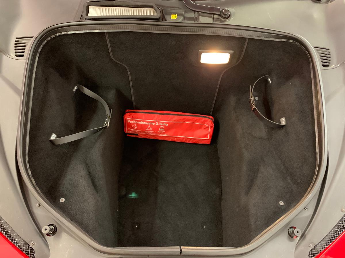 Die Tasche mit Bordmappe und Werkzeug verstaue ich hinter dem Beifahrersitz, das Reifenflickgelumpe habe ich gleich ganz rausgeschmissen. Ferrari packt einem das bei jedem Service wieder rein, weil es da eh getauscht wird. Das Flickmittel (Schaum) läuft wohl ab bzw. härtet aus.