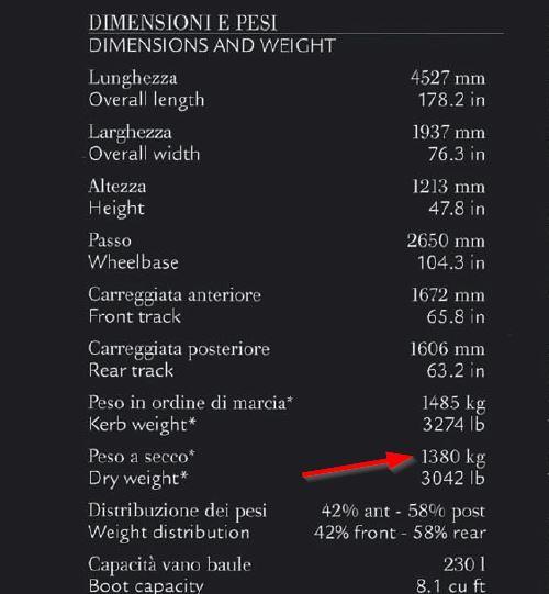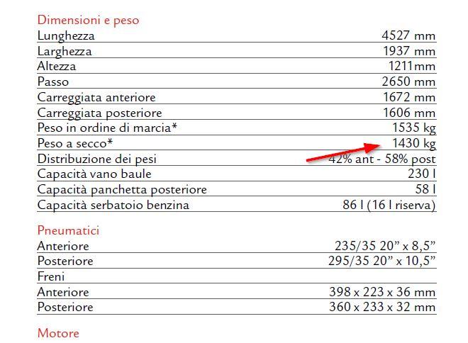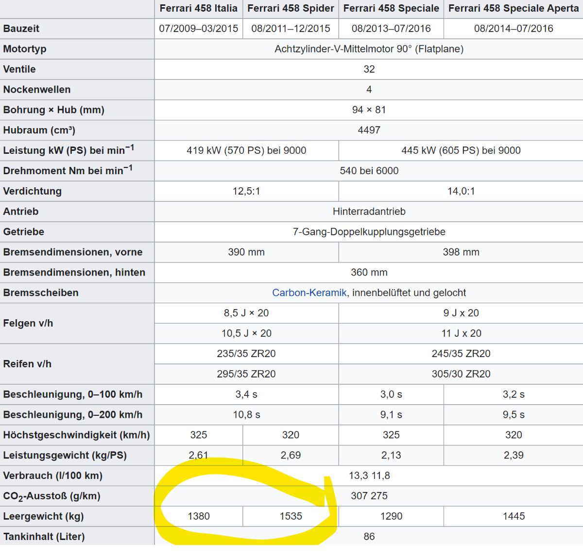 ams spricht von Leergewicht vollgetankt, Ferrari von Trockengewicht (peso a secco)
