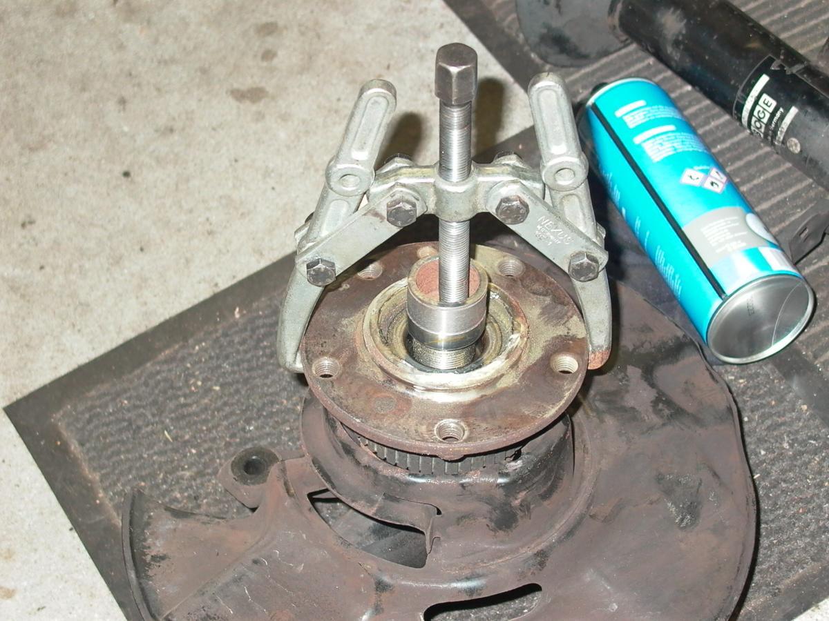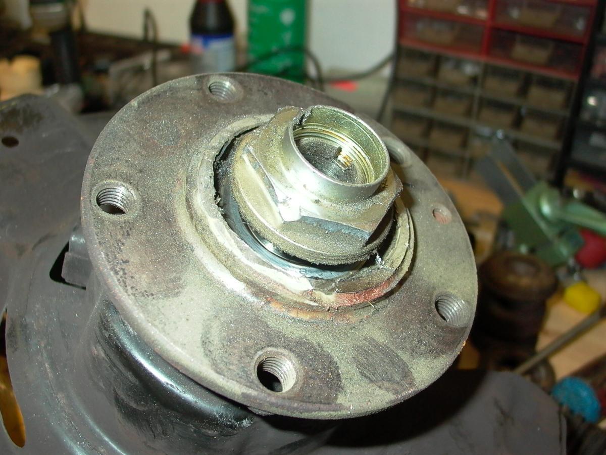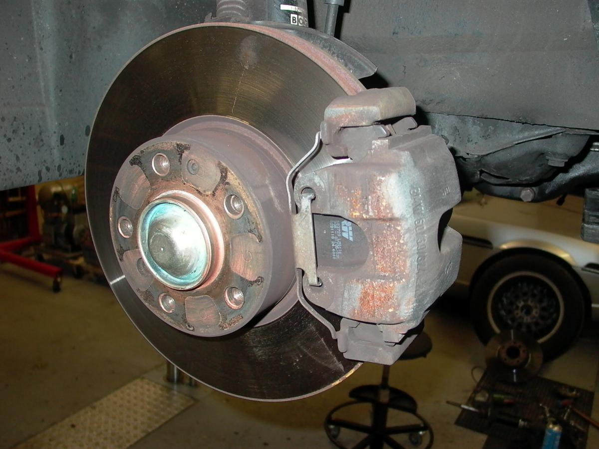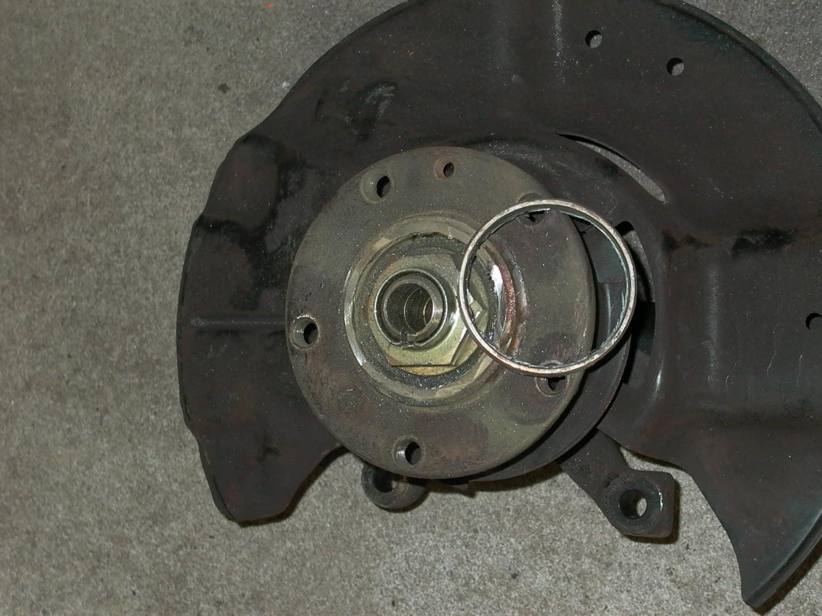 Soweit fertig. Jetzt kommen die neuen Naben drauf. Mir wurden leider die falschen geliefert und ich mußte neu bestellen. Es gibt sogenannte symmetrische und asymmetrische Naben. Das Gewinde zum Fixieren der Bremsscheiben ist einmal symmetrisch zwischen zwei Radbolzenlöchern, einmal asymmetrisch. Wäre im Prinzip wurscht, wenn nicht die ABS Ringe beider Versionen unterschiedliche Durchmesser hätten ...