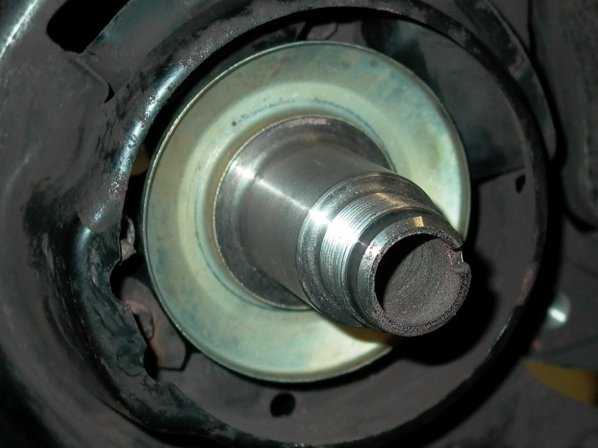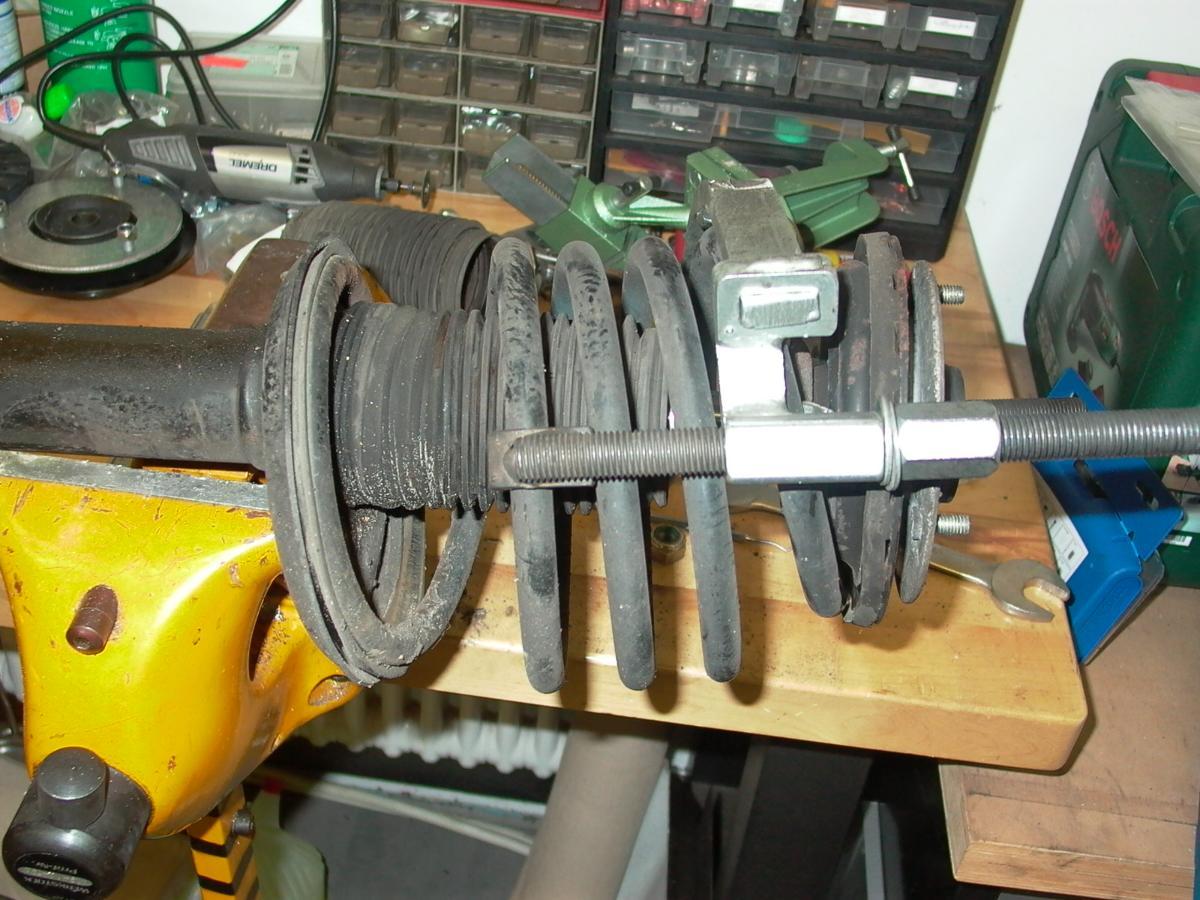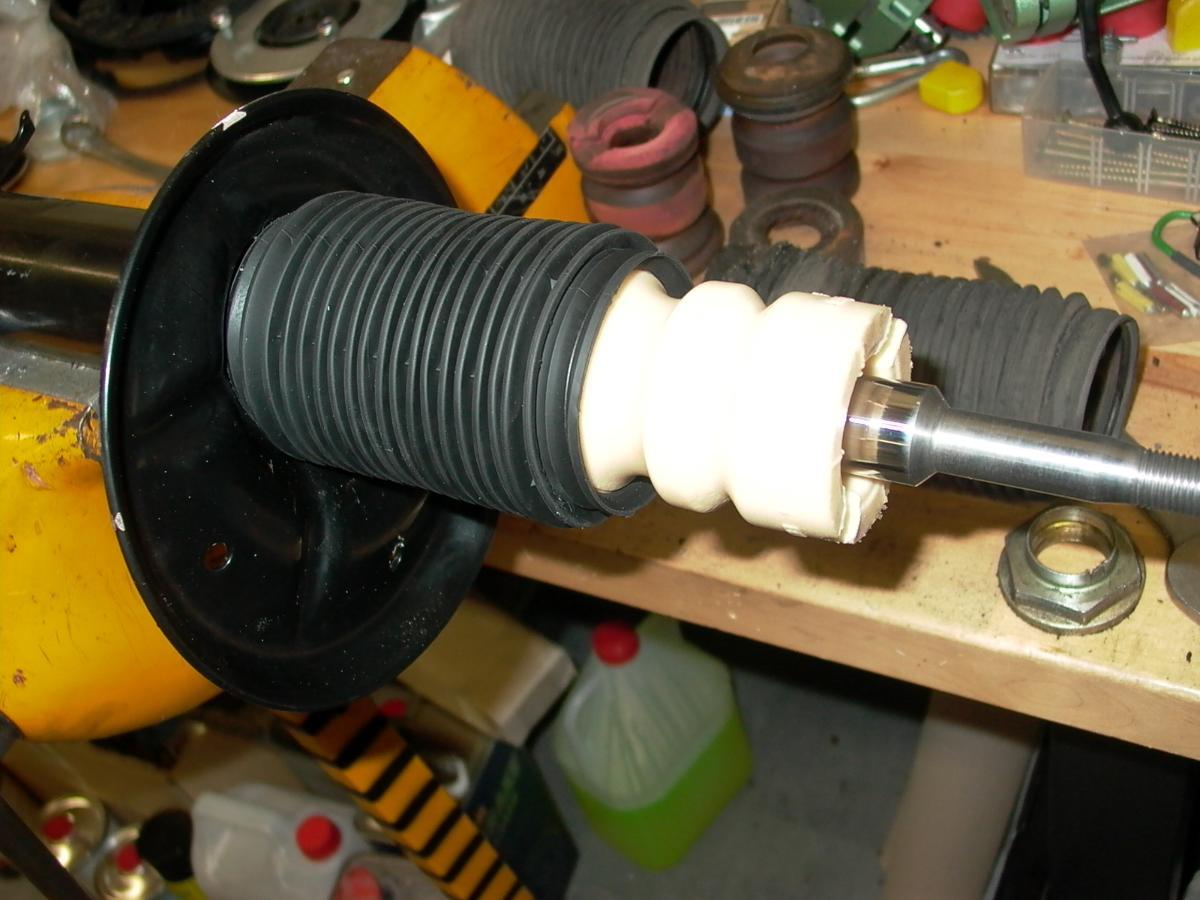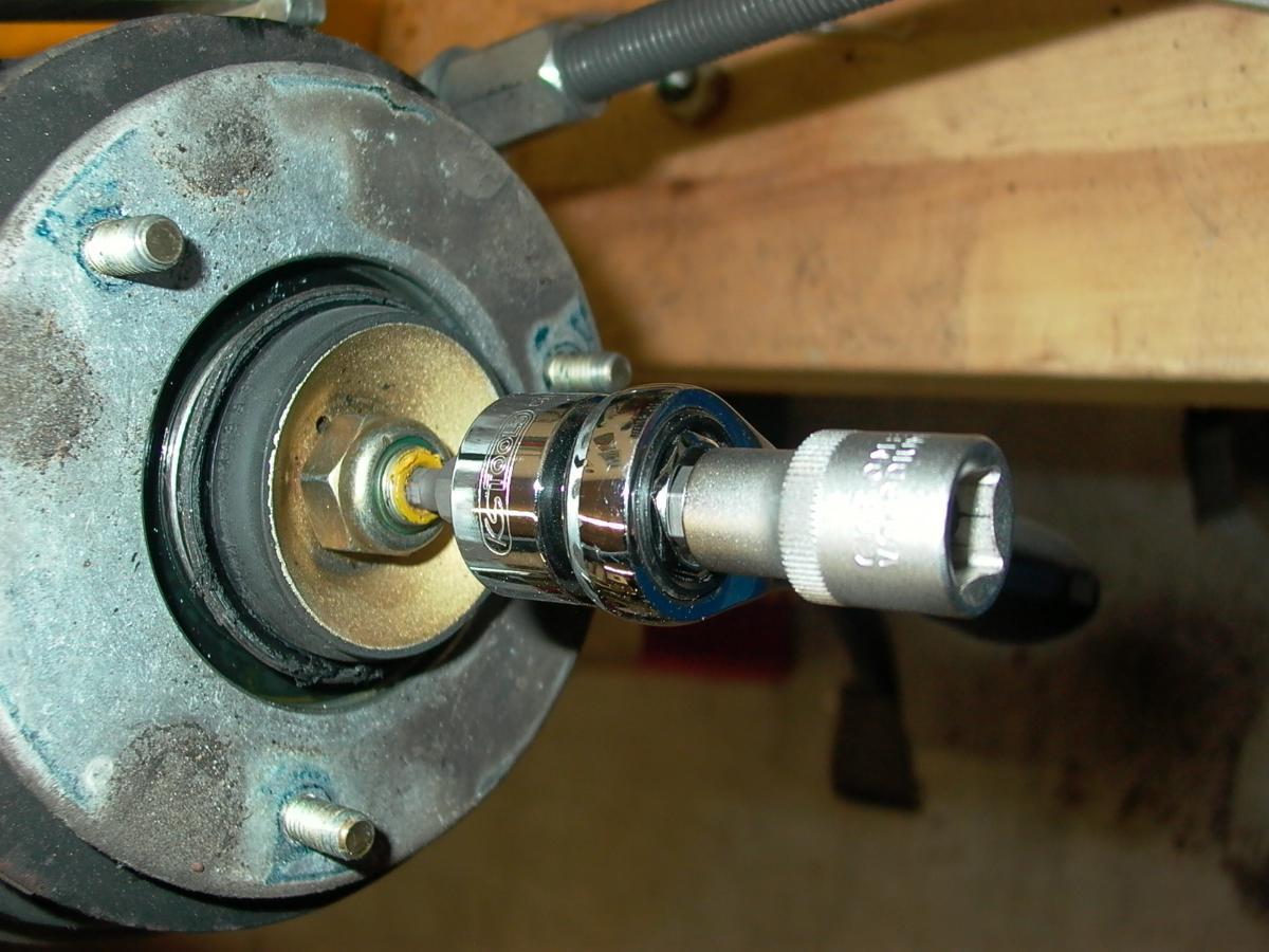 Dann wird die Feder eingesetzt, werden weitere Teile des Domlagers aufgefädelt und wird die Mutter angebracht und angezogen. Die Kolbenstange hat innen einen Inbus, so dass sie gegen Mitdrehen gehalten werden kann. Gut wenn man eine hohle Nuss mit Außenantrieb hat, dann kann der Inbusschlüssel durch die Nuss durchgreifen und es geht einfach und ohne Murkserei.