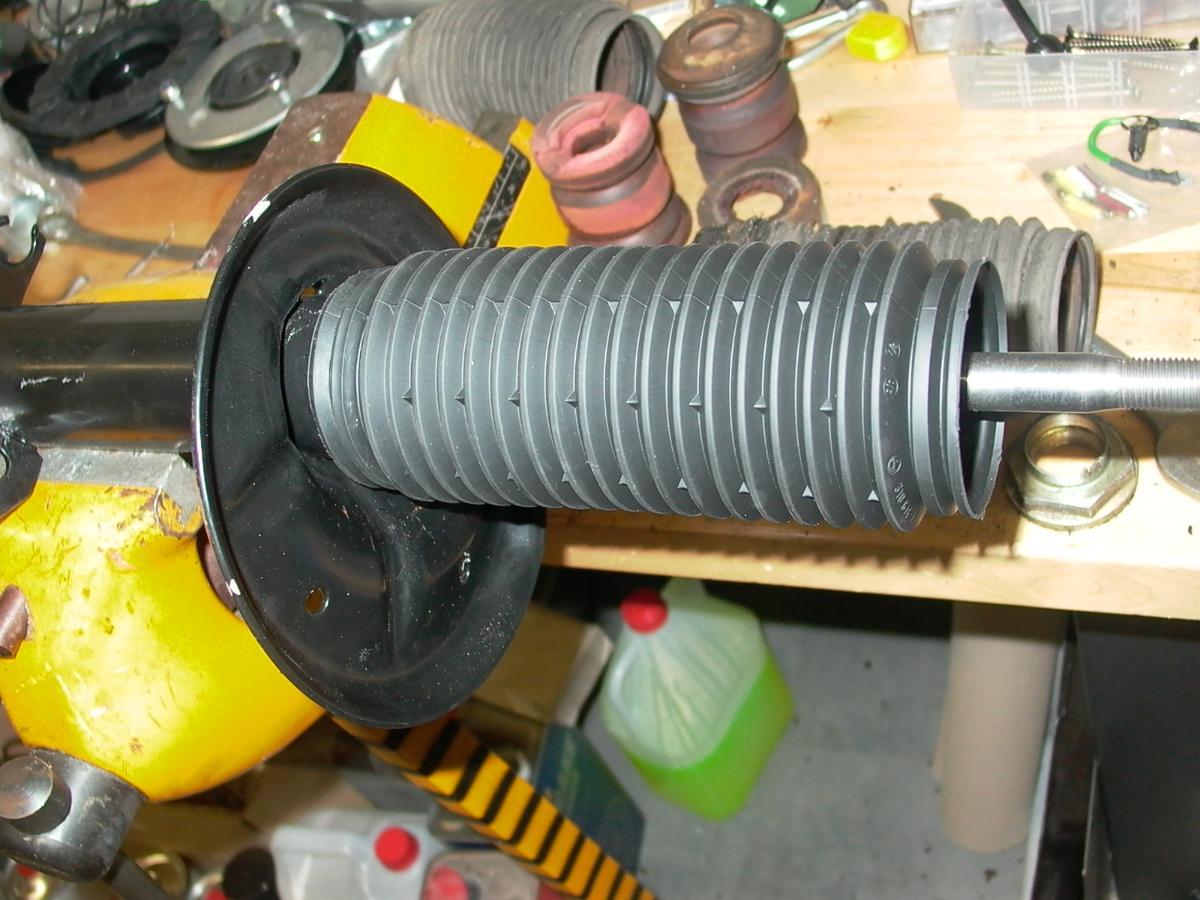 Dann kann wieder zusammen gebaut werden. Das untere ende des Balges muss auf eine Plastikring aufgezogen werden, bissl eine Fummelei. Der sogenannte Zusatzdämpfer (gelb) bekommt dann das andere Ende des Balges aufgezogen. Der Zusatzdämpfer sitzt sehr stramm auf dem dickeren Teil der Kolbenstange, kräftig drücken.