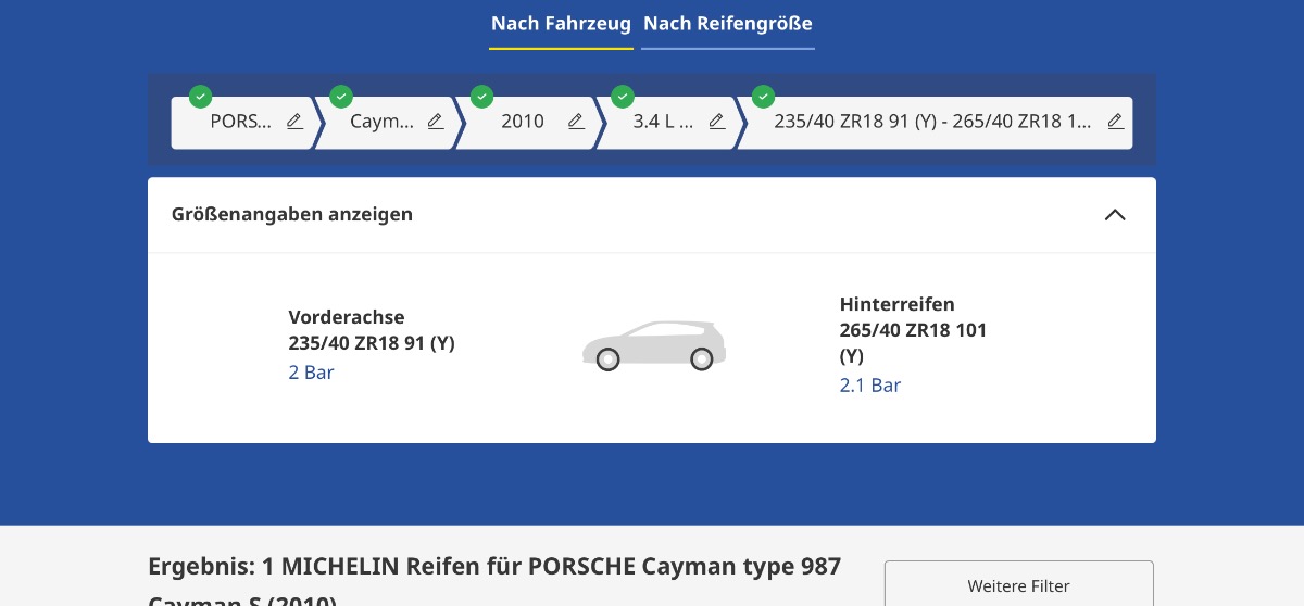 Auf der Michelin-Seite ist auch die 19"-Variante (235 u. 265/35-19) für den 987.1 S (auch mit 2,0 u. 2,1 bar) ausgewiesen.