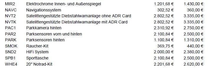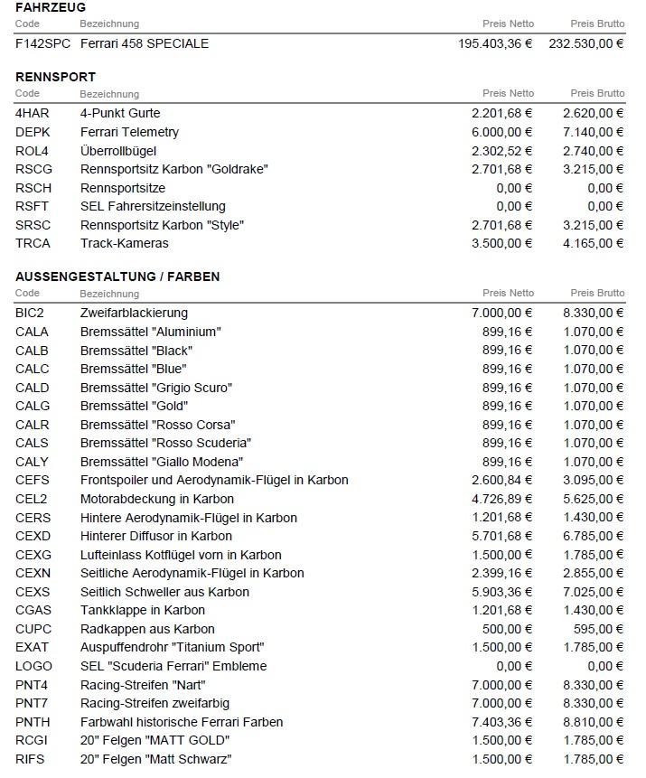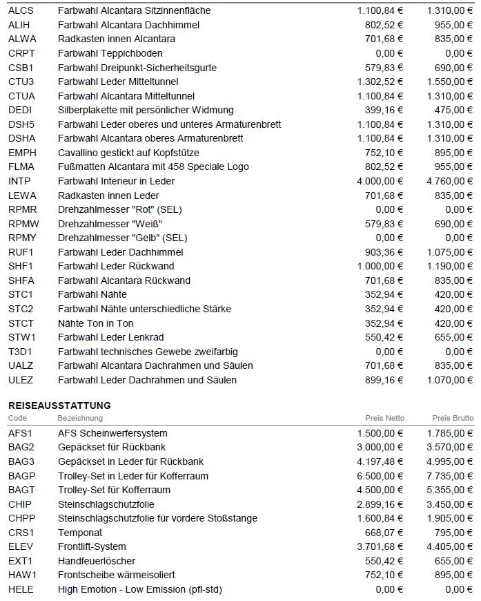 Preisliste für Ferrari 458 Speciale