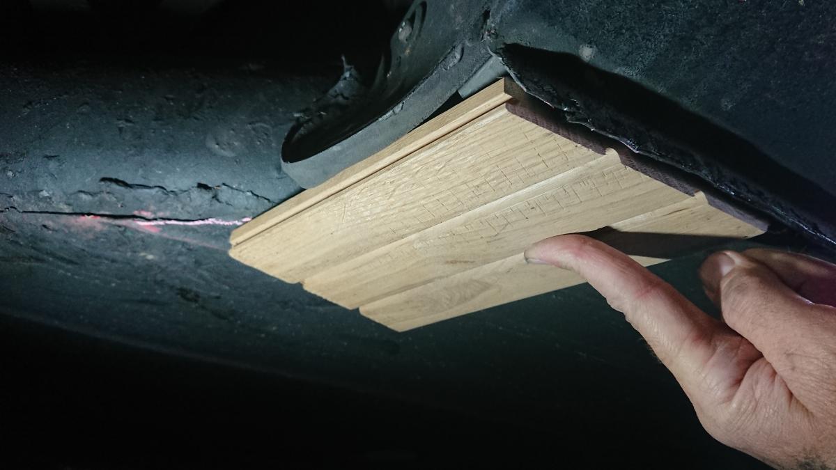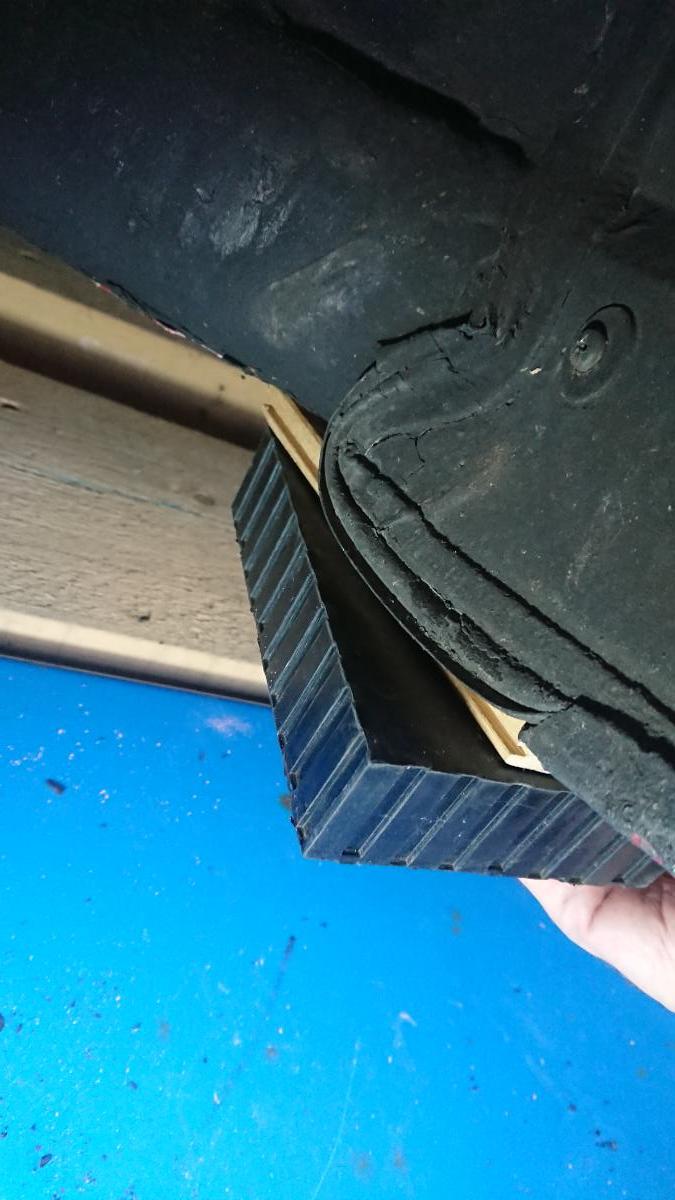 Drum habe ich mir dann ein Brettl schräg entlang der Schweller Kante geschnitten das dann vor zum Diagonalträger geht (da weiß ich sicher, dass man das Auto daran heben kann)