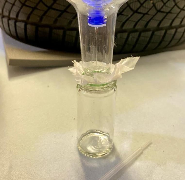 Final bekamen die Räder eine Keramikversiegelung spendiert. Leider wurde ich beim Abbau und während des Aufräumens etwas abgelenkt (Tochter beim Rollerbladen hingefallen und sich die Bänder gedehnt). So vergaß ich leider die Flasche mit der Keramikversiegelung zu verschließen. Erst zwei Tage später stellte ich das Missgeschick fest und verschloss das Fläschen wieder. Heute wollte ich einen weiteren Radsatz fertig machen und zu meinem Pech (was vorhersehbar war) befanden sich in der Flasche bereits kleine, feste Keramikstückchen. So kann man das natürlich nicht mehr verarbeiten. Da es aber um meine Räder geht, hatte ich nichts zu verlieren und filterte die Keramikversiegelung mittels eines sehr simplen, aber auch sehr effektiven Aufbaus. Primitiv aber gut. Hat wunderbar geklappt.