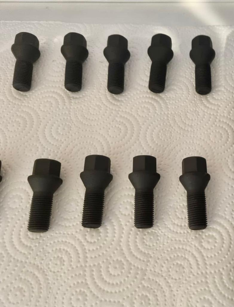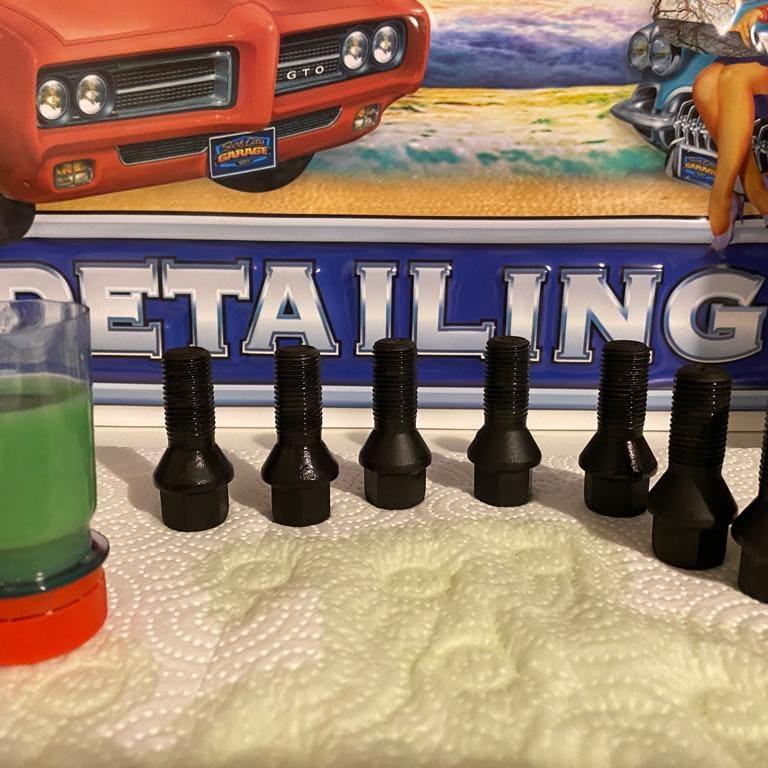 3. Die nun fertigen Radbolzen sehen danach so aus und wurden (von mir selbst, denn selbst ist die Frau) wieder aufs Wägelchen geschraubt. Die Radbolzen von einem Neufahrzeug, welches ich diese Woche endlich ausgeliefert bekam, habe ich gleich mitbehandelt, damit der Flugrost erst gar keine Chance hat mich zu besuchen.