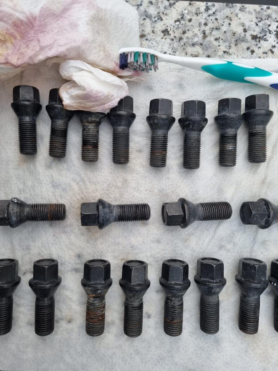 1. So sahen meine Radbolzen nach der letzen Demontage diese Woche aus. Mit dem in meinen Augen besten Flugrostentferner den man für Geld kaufen kann, benetze ich die Radbolzen und lasse ihn kurze Zeit einwirken. Dann schrubbe ich was das Zeug hält die restlichen Flugrostpartikel mit einer Zahnbürste von den Bolzen runter.