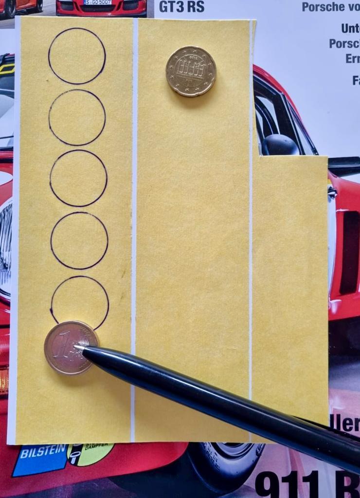 Ich stecke gerade in den Vorbereitungen für einen Poliergang, den ich die nächsten Tage starten möchte. Da das Fahrzeug unser eigenes ist, habe ich hier schon öfters Hand angelegt und kenne alle Problemchen/kritische Stellen etc. Ich werde am Fahrzeug u.a. einige Teile aus Kunststoff abkleben vorm eigentlichen Polieren und halte gerade das Abklebeband in Händen. Gerade dachte ich mir, das wäre eventuell auch für den Einen oder Anderen hier von Interesse was ich da mache. Es geht mir gar nicht um das Abklebeband selbst, hierzu deswegen nur einige wenige Worte - ich nutze basierend auf eigenen Erfahrungen ein Abklebeband, dass sich spurenlos ohne Klebereste nach dem Polieren abziehen lässt, aber dennoch stark genug ist die Wärme sowie die Kräfte durch die Poliermaschine bei einem möglichen Kontakt wegzustecken. Ich mag keine Abklebetapes, die nach dem Abziehen Streifen hinterlassen, weil sich zum Beispiel der Kleber ablöste. Viel mehr geht es mir um eine kleine Hilfe (aus Klebeband) die ich mir mittlerweile selbst vorbereite. Hierzu nutze ich eine Trägerfolie (gibts für 'nen schmalen Taler im Netz in Hülle und Fülle zu kaufen) und klebe darauf ein paar Streifen des Abklebetapes meiner Wahl auf. So lässt sich das Tape problemlos ablösen ohne etwas von seiner Klebekraft einzubüsen. Auf die Klebestreifen lege ich nun einen Gegenstand, der im Durchmesser genau den Parksensoren meines Fahrzeuges entspricht. In den Fall sind es 14 Parksensoren, 8 Große und 6 Kleine. Im gezeigten Beispiel nutze ich jeweils eine 2€-Münze und eine 20Cent-Münze, lege diese auf, umkreise sie und schneide sie danach mit einer Nagelschere sauber aus (schneidet runder als eine Haushaltsschere). Was nun aussieht wie ein Haufen gelber Hämorrhoidenpflaster sparrt später viel Zeit. Wenn ich schließlich am Fahrzeug beginne die entsprechenden Bauteile abzukleben, kann ich einfach die empfindlichen und durch Polieren relativ leicht zerstörbaren Parksensoren in wenigen Sekunden rundum abkleben. Ich ziehe das Tape von der Trägerfolie und positioniere es direkt auf jedem Parksensor. Zack und fertig. Der wesentliche Vorteil liegt für mich an der späteren Zeitersparnis, wenn ich am Auto beginne die Vorbereitungen zu treffen. Die vorbereiteten Tapekreise passen perfekt auf die Sensoren, weder stehen sie zu weit über (ca. 1mm auf jeder Seite empfinde ich für gesund für mehr Schutz der Parksensoren), noch sind sie zu klein. Das in meinen Augen nervige Rumgezuppel und Zurechtgereiße des Tapes, damit es irgendwie gerade noch so auf die runden Sensoren passt und sich nie wirklich so richtig stimmig anbringen lässt, entfällt. Ich fertige mir in der Regel immer gleich mehrere dieser Tapekreise an und in wenigen Minuten hat man alle Durchmesser für die nächsten Poliergänge gleich mal parat liegen. Hier noch ein Bild um sich das Ganze besser vorstellen zu können...