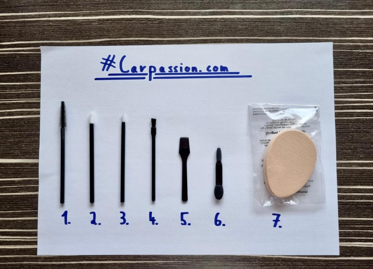Besonders gerne nutze ich Nummer 1 + 2 für die kleinsten-kleinsten-mini-winzig-Spalten im Interieur. Gerade die Spaltmaße zwischen einzelnen, belederten Teilen (z.B. zwischen Interieurleisten und Armaturenbrett/Lenkrad/Spaltmaße von Lüftungsrahmen/Spalten von Bedienelementen wie Knöpfe und Tasten) lassen sich sehr effektiv damit reinigen. Mein Favorit ist die Nummer 6, der sogenannte Lidschattenapplikator. Diesen kann man optimal anwenden um damit um Modellschriftzüge/Typenbezeichnungen ("Ferrari", "Turbo", "RS" etc.) herum mit etwas Politur zu polieren. Manchmal kommt man manuell selbst mit zugeschnittenem Schaumstoff nicht mehr an gewisse Stellen heran. Und genau hier eignet sich dieser ca. zwischen 3-6 mm breite Lidschattenapplikator ideal um den Lack mit mittlerer Abrassivität auf Vordermann zu bringen. Auch die Schriftzüge selbst bzw. deren Vertiefungen lassen sich sehr gut damit bearbeiten. Dieses Intrument kann ich gewissenhaft wirklich jedem Pflegeenthusiast besonders empfehlen.