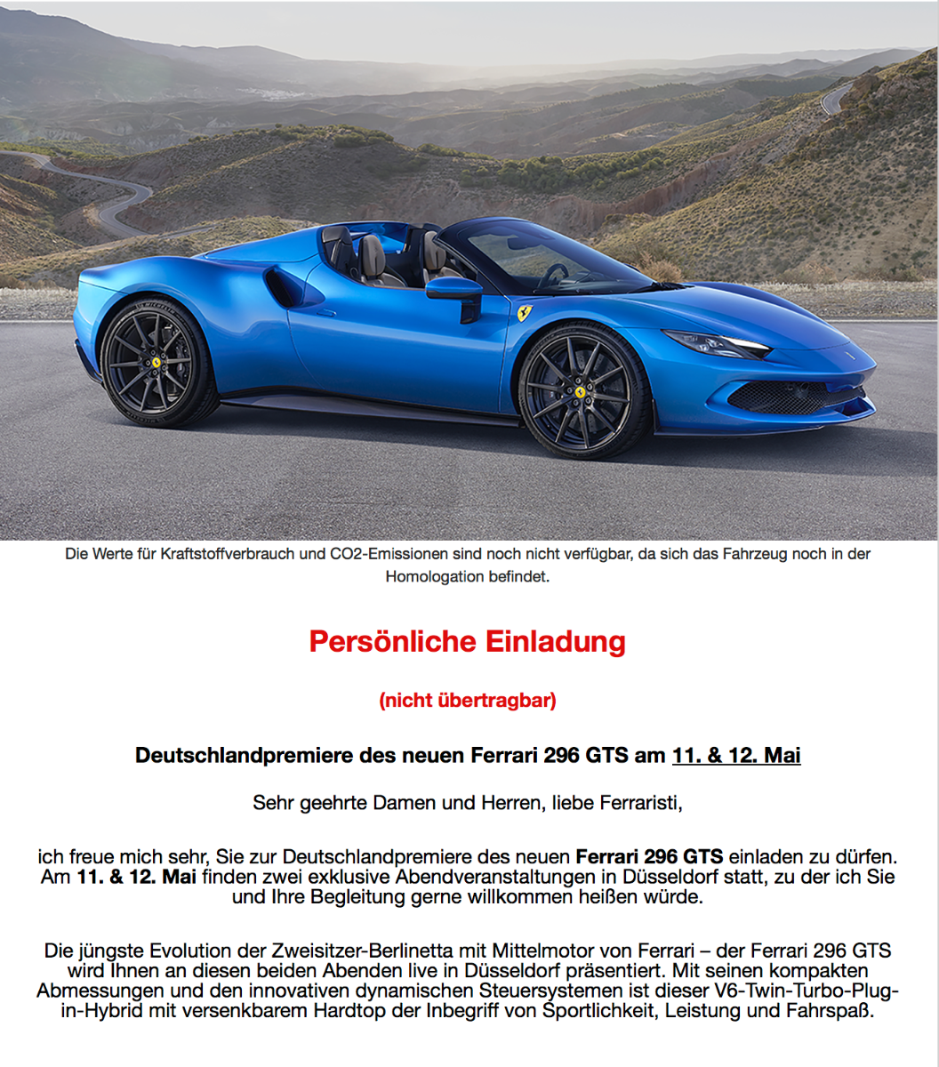 wir freuen uns sehr, Sie und Ihre Begleitung zur Deutschlandpremiere des neuen Ferrari 296 GTS am 11. Mai in Düsseldorf willkommen heißen zu dürfen.
