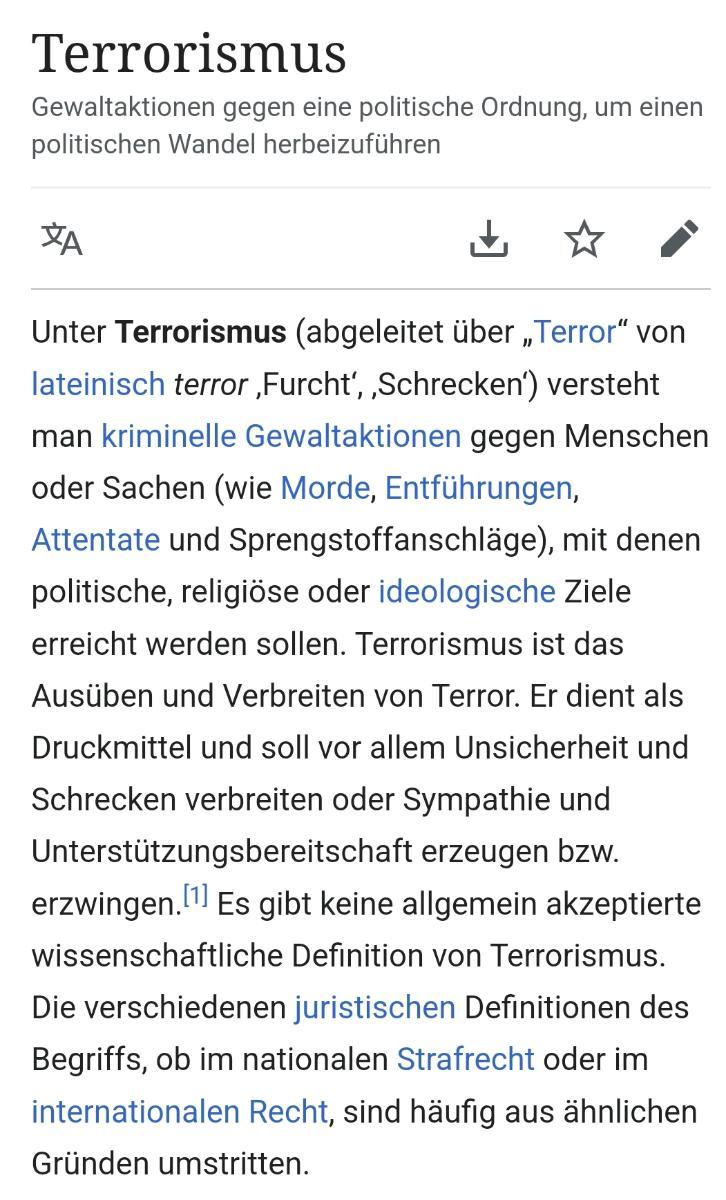 Man kann regelmäßig unterschiedliche Quellen finden zur Definition von Dingen. Mir ist allerdings hier der Begriff "Terroristen" auch zu überzogen, ich bevorzuge bei den Grünen & Co., Klimaklebern etc. den Begriff "Umwelt-Taliban": haben die Wahrheit gepachtet und wollen sie mit absolutistischen Mittel durchsetzen (Frau Baerbock möchte uns z.B. umerziehen, nicht also der Wille der Mehrheit zählt, sondern diese soll sich den Grünen anpassen)