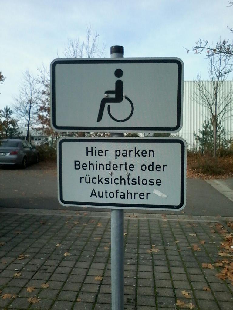 Man könnte auf das Schild auch schreiben: "Hier parken körperlich und geistig Behinderte - Letzgenannte teilweise ohne Behindertenausweis" 🙂
